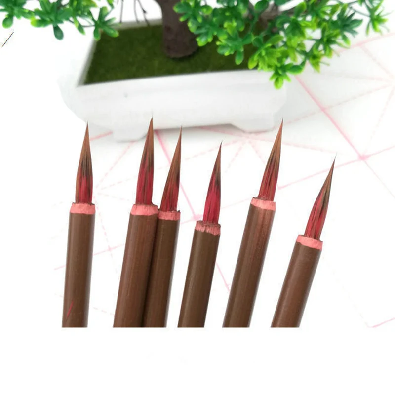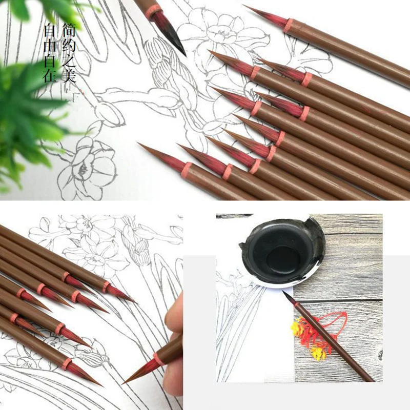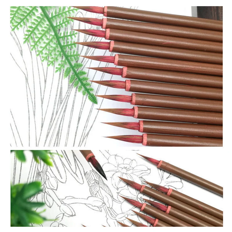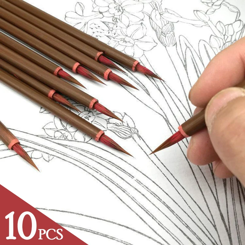 10 PCS Chinese Line Marking Pen Red Weasel Hair Ink Painting Brush Bamboo Handle Thin Line Brush Watercolor Oil Acrylic Supplies