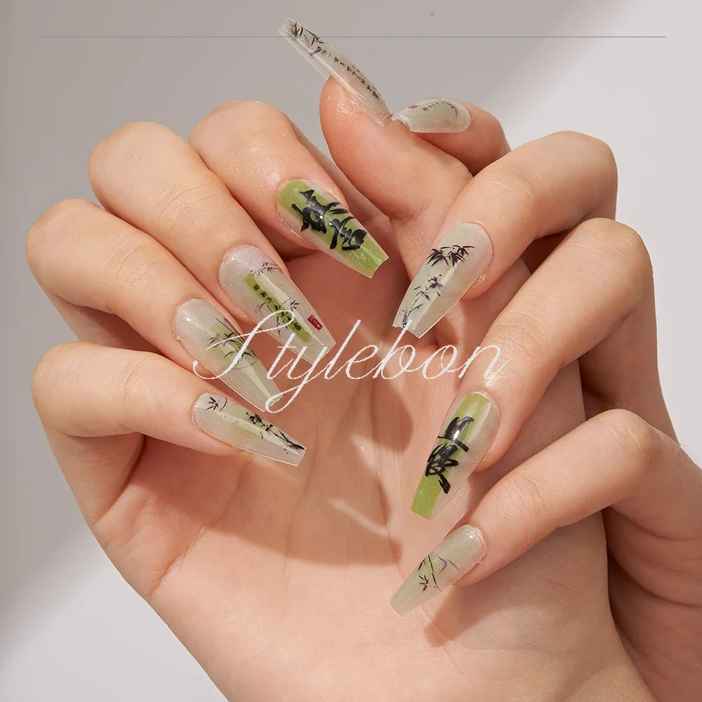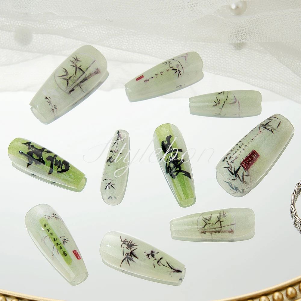 10PCS Chinese Bamboo Long Press on Nails Poetry Painting Design Fake Nails Set Reusable Full Cover Acrylic Nails Art for Women
