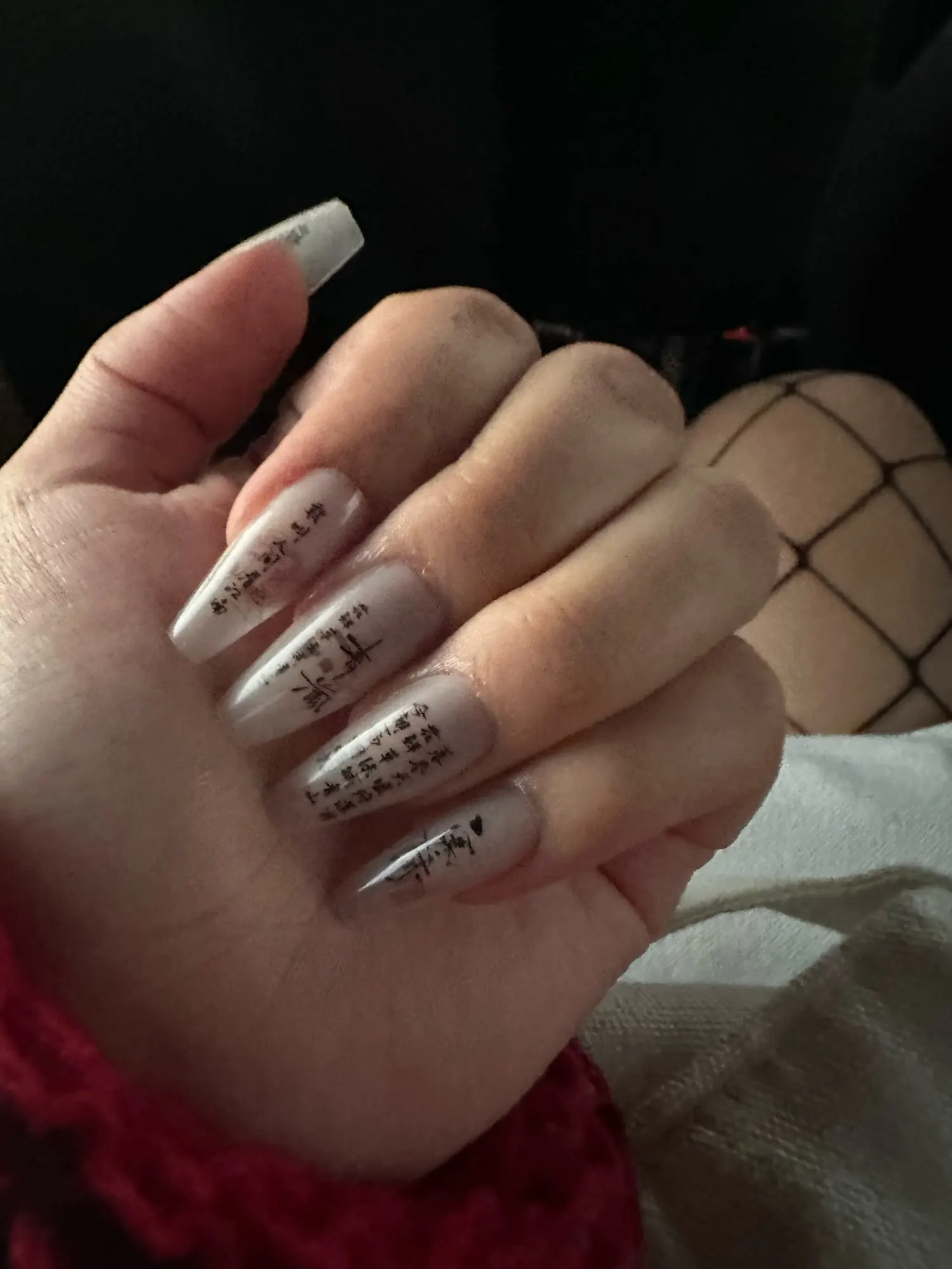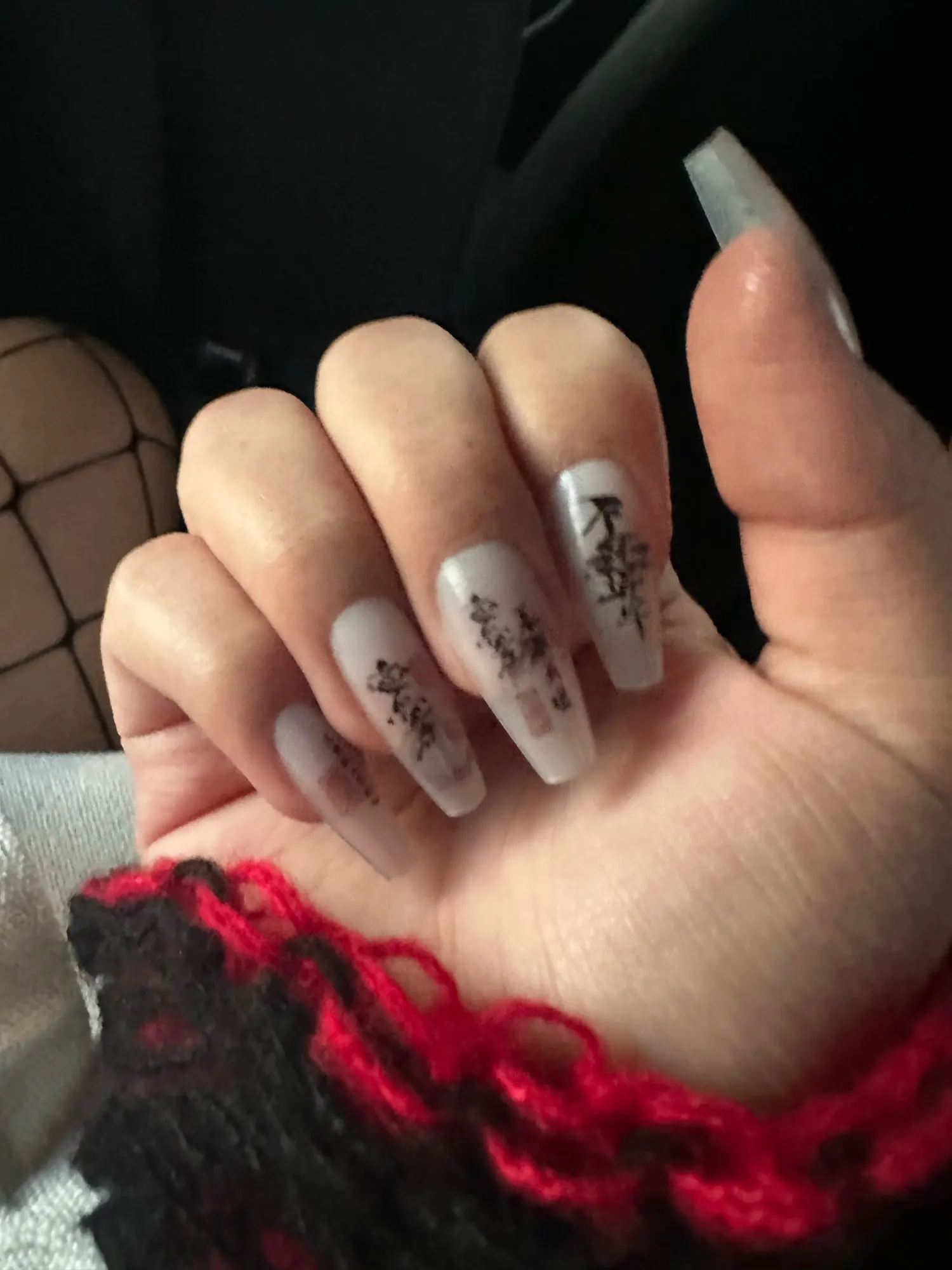 4. The nails are decorated with Chinese characters in calligraphy style, highlighting the oriental culture.