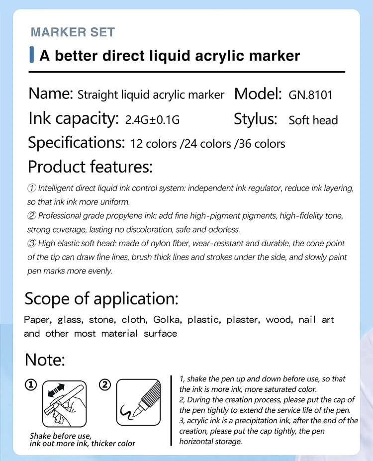 Each pen in the set is filled with rich, pigmented acrylic paint that dries quickly and provides a durable, long-lasting finish. The pens have a smooth, easy-to-control tip that allows for precise and detailed application, making them perfect for both beginners and experienced artists.