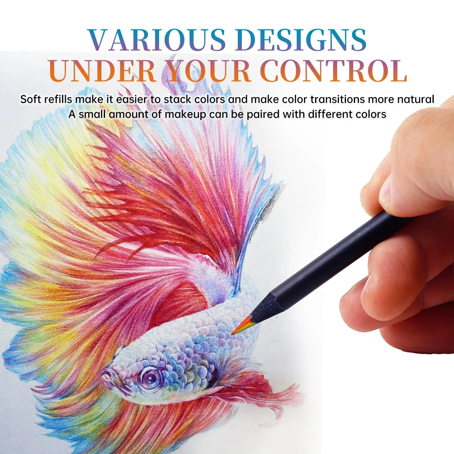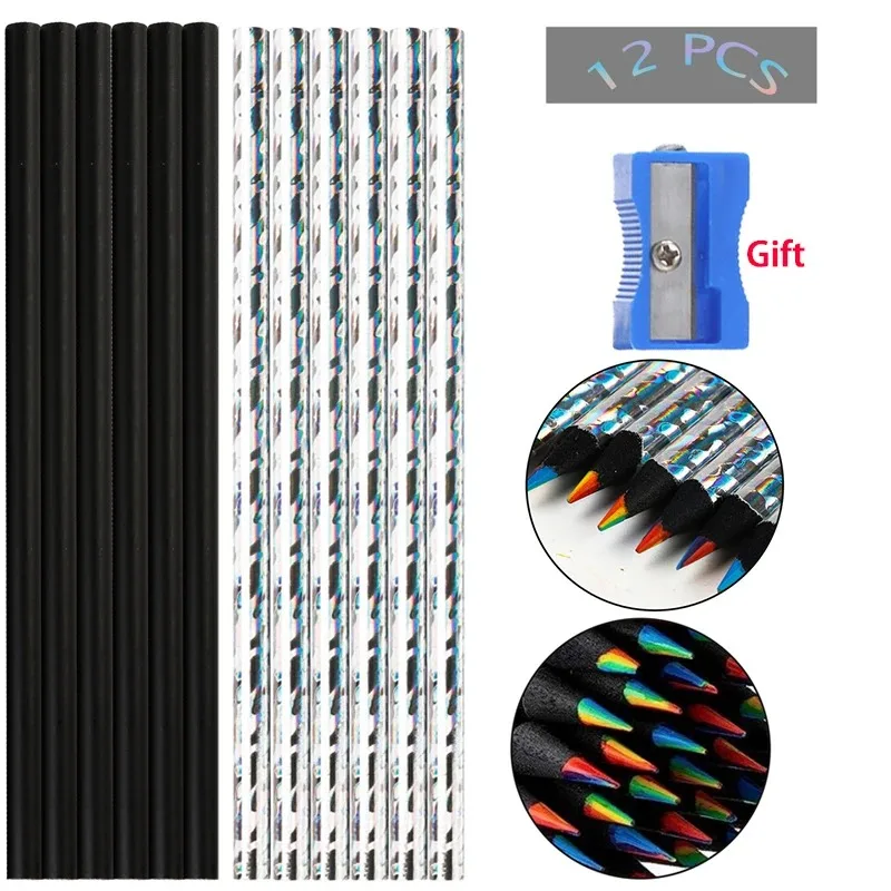 Red, orange, yellow, green, cyan, blue, and purple are the 7 colors that make up each rainbow colored pencil. You can rotate the pencil to get different colors, creating a rich and varied palette that is suitable for sketching and drawing.