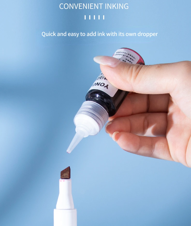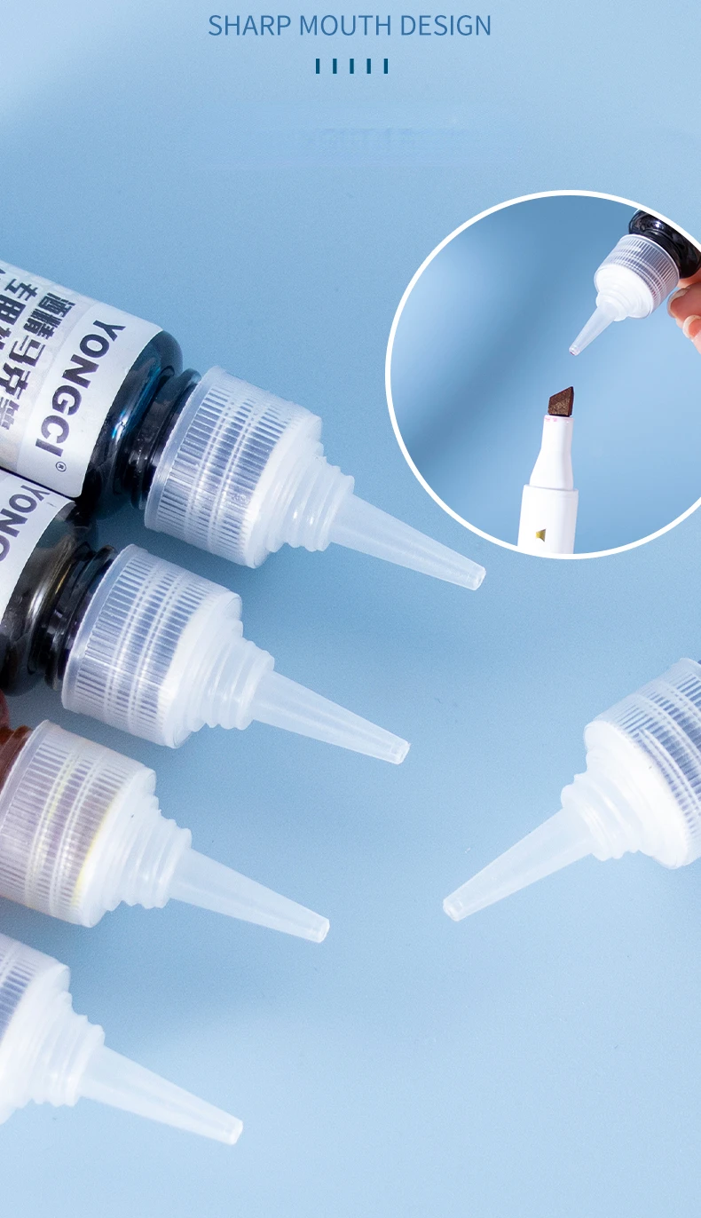 Features: Self-contained dropper, waterproof and quick-drying, full range of colors, professional quality, environmentally friendly ink, natural color