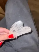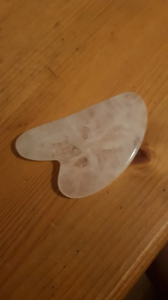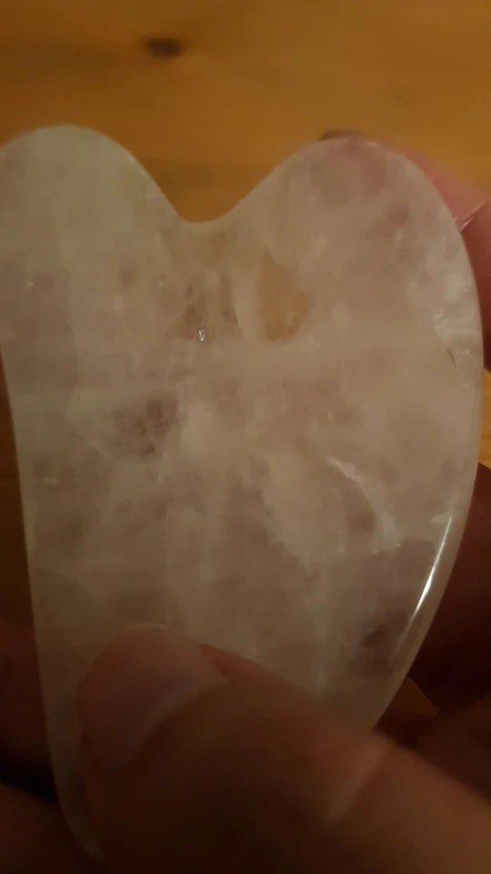 3. Use upward motions to move the guasha gently over your forehead,cheeks,around the lip area and neck. Close your eyes and roll gently over your eyelids if you have puffy eyes or bags under your eyes.