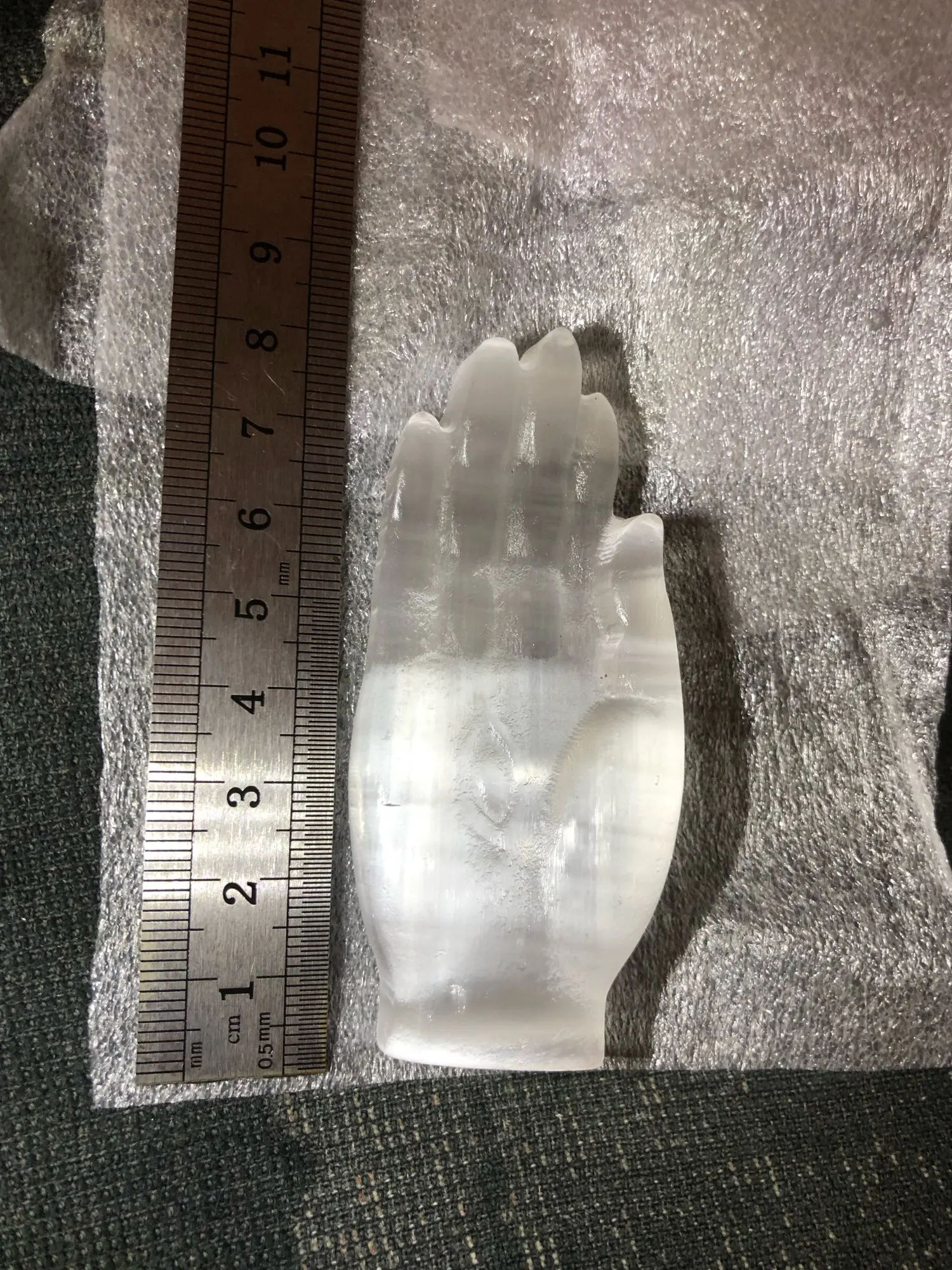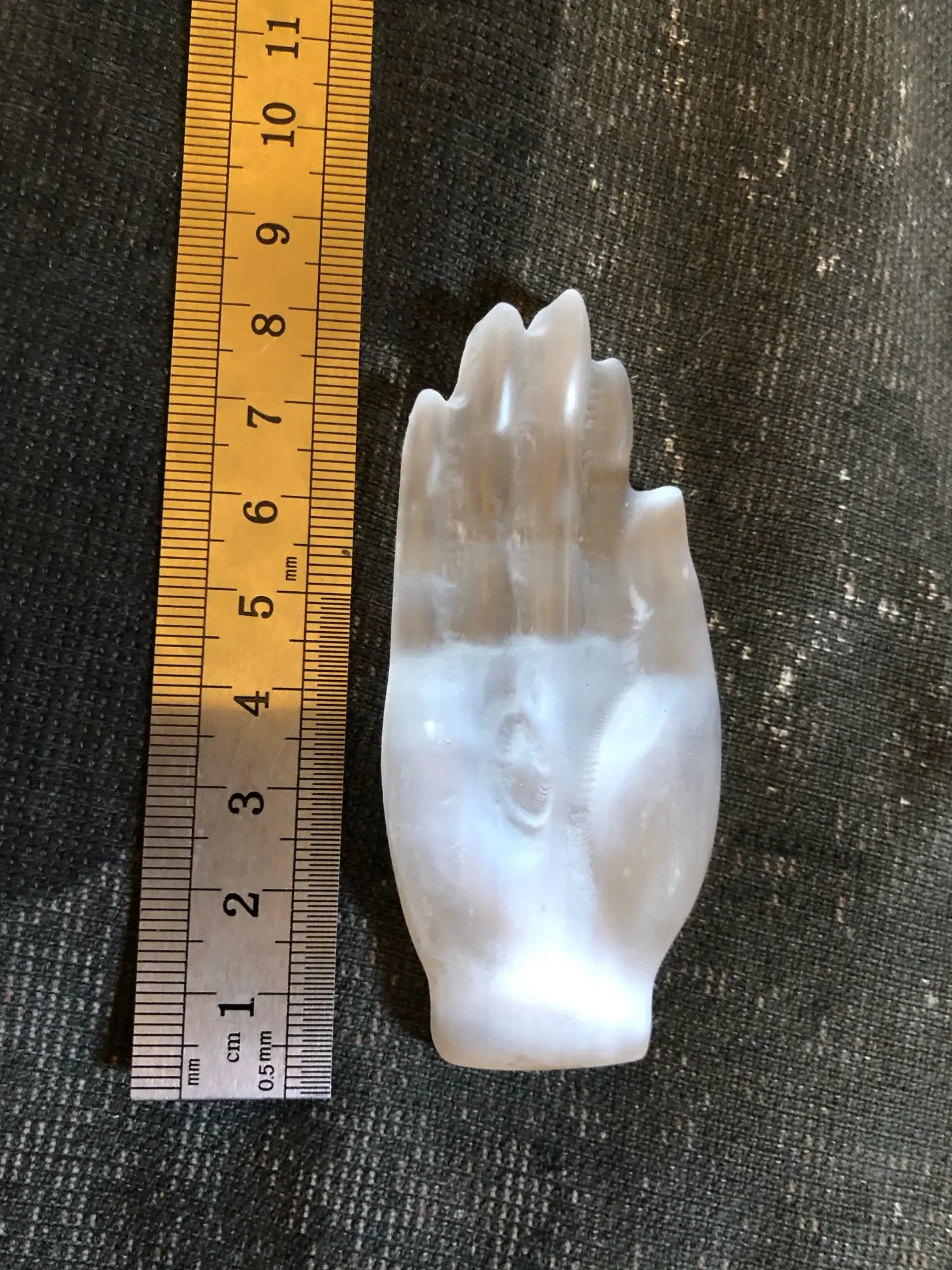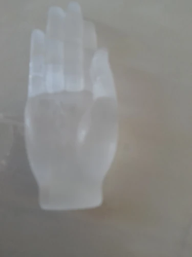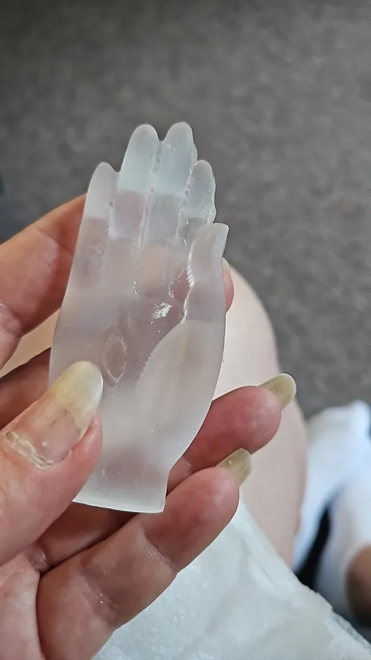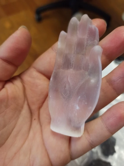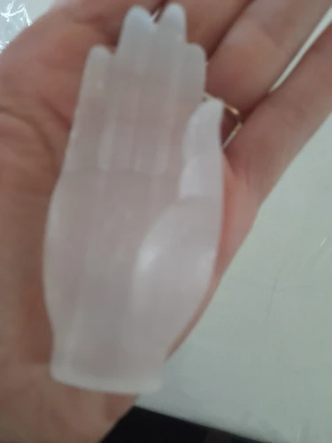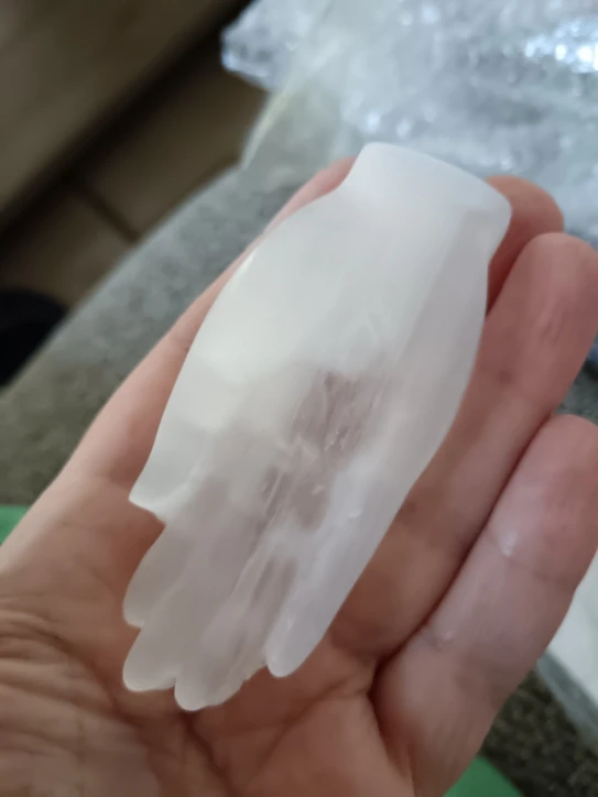 Okay, well! Selenite carved hand as described in the ad. The sculpture is pretty. I am a little surprised at the hardness of the stone; Selenite is usually much plus fragile. I’m going to show it to a gemologist to give me his opinion.