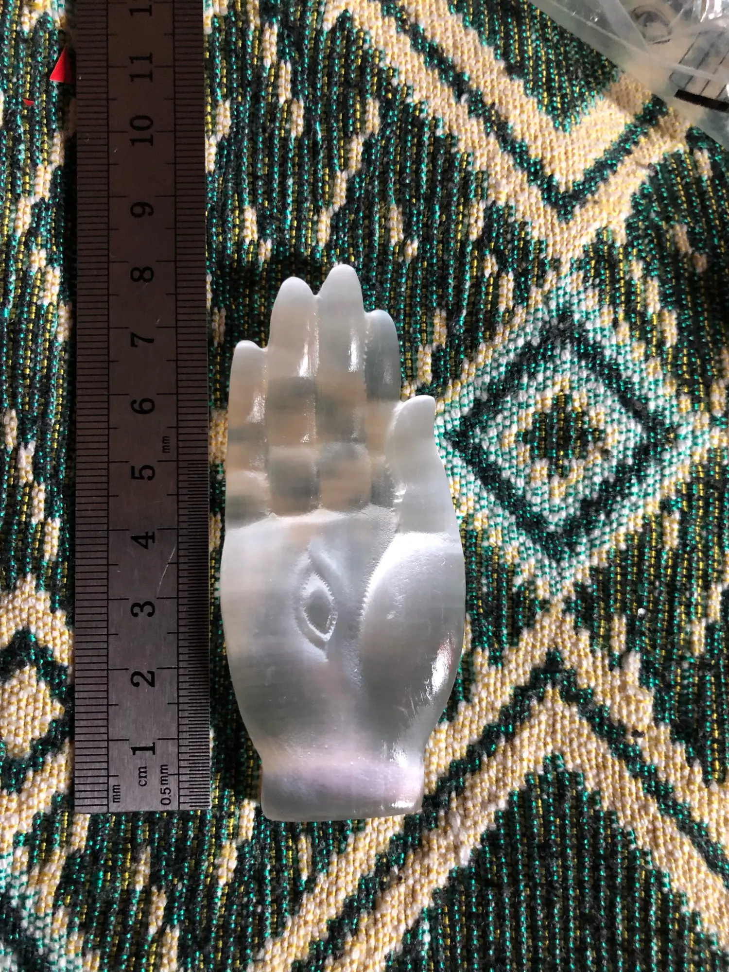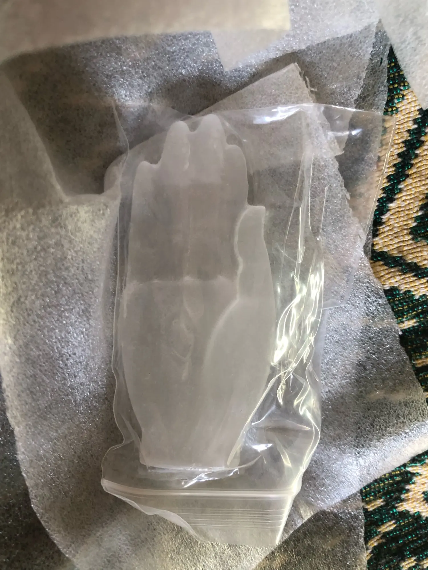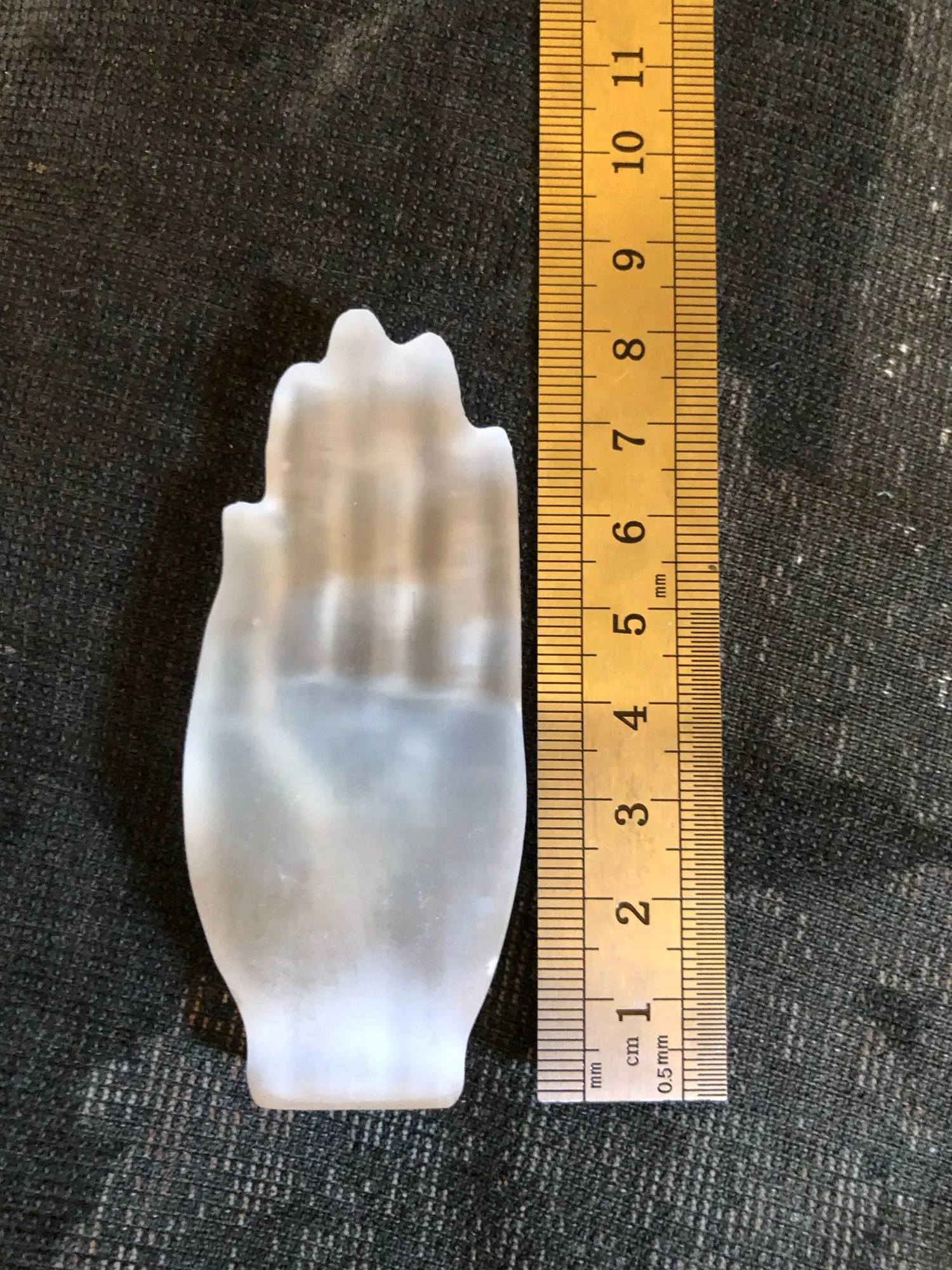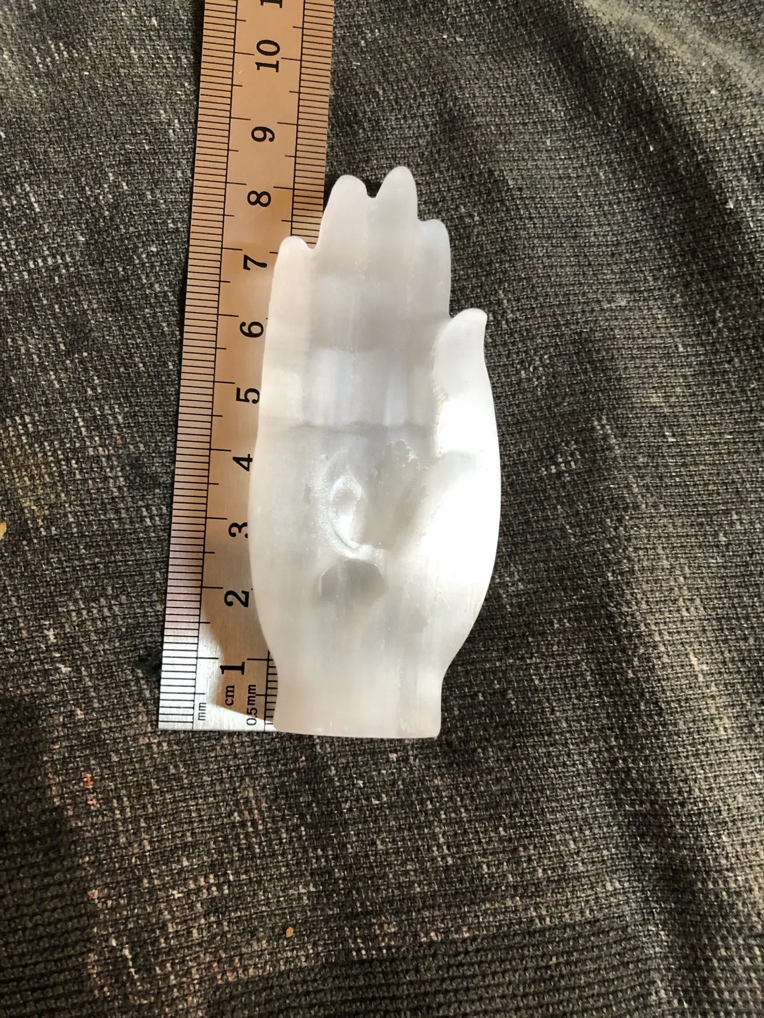 Okay, well! Selenite carved hand as described in the ad. The sculpture is pretty. I am a little surprised at the hardness of the stone; Selenite is usually much plus fragile. I’m going to show it to a gemologist to give me his opinion.