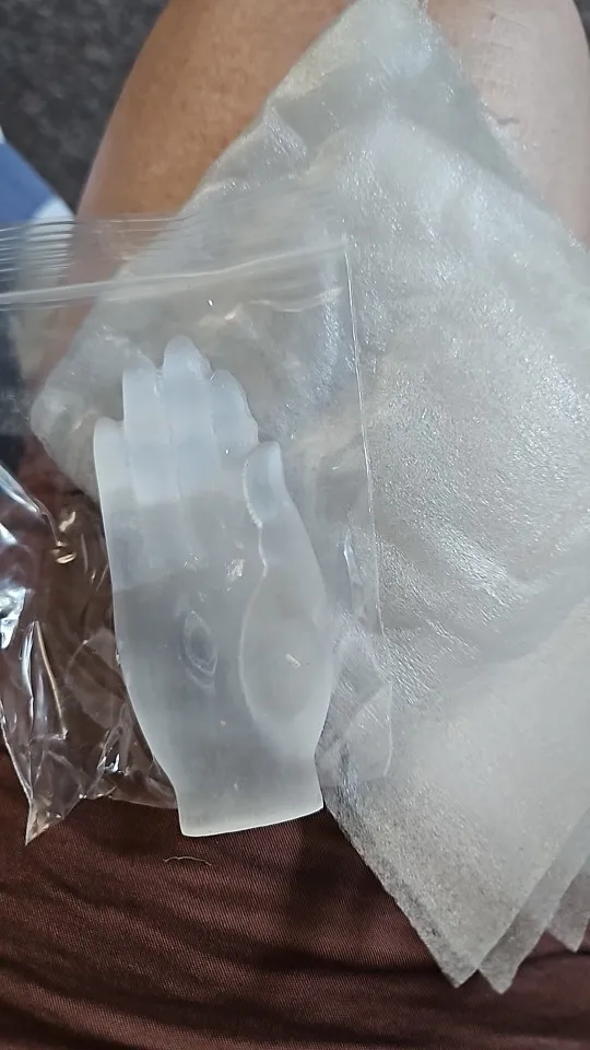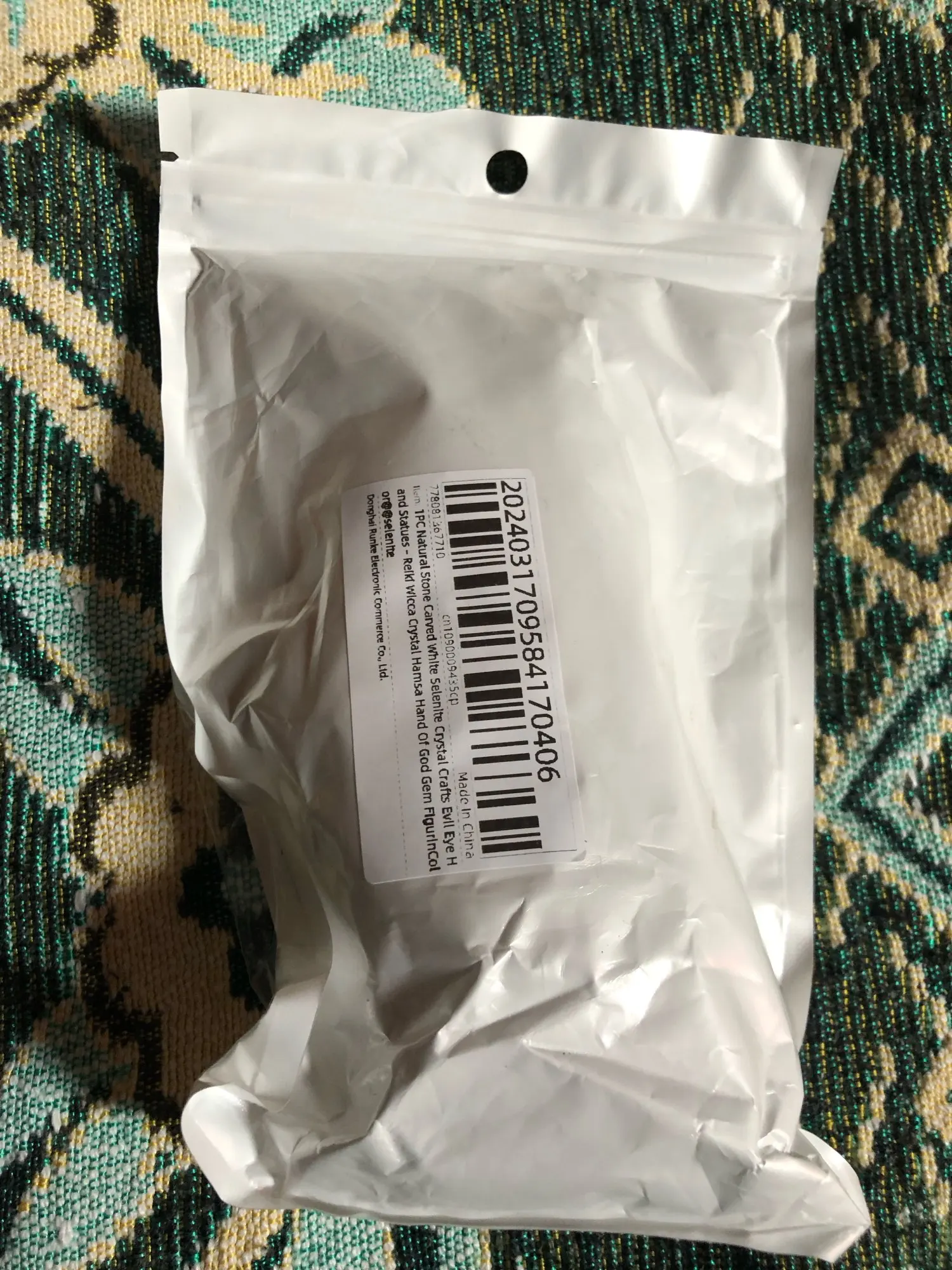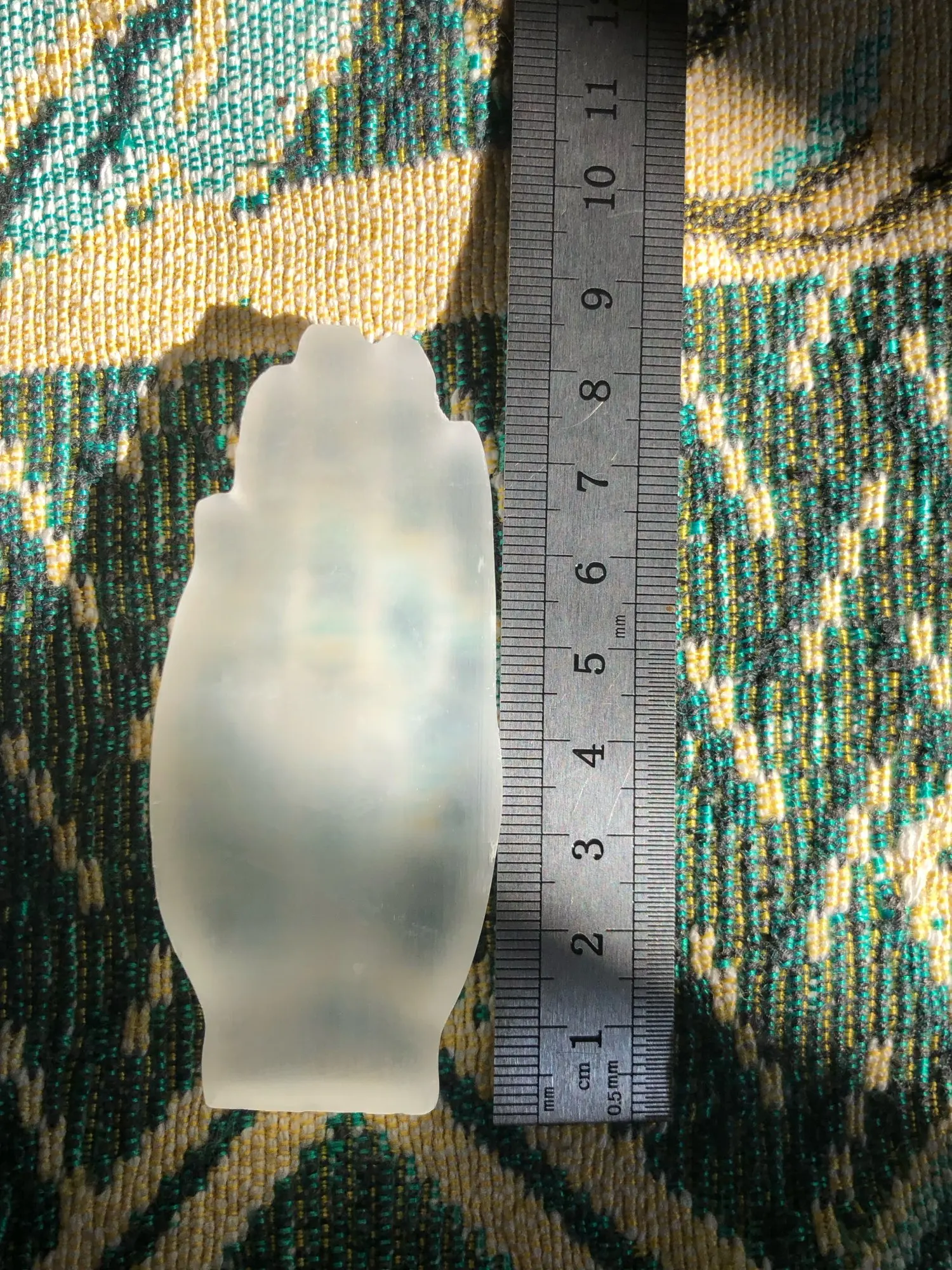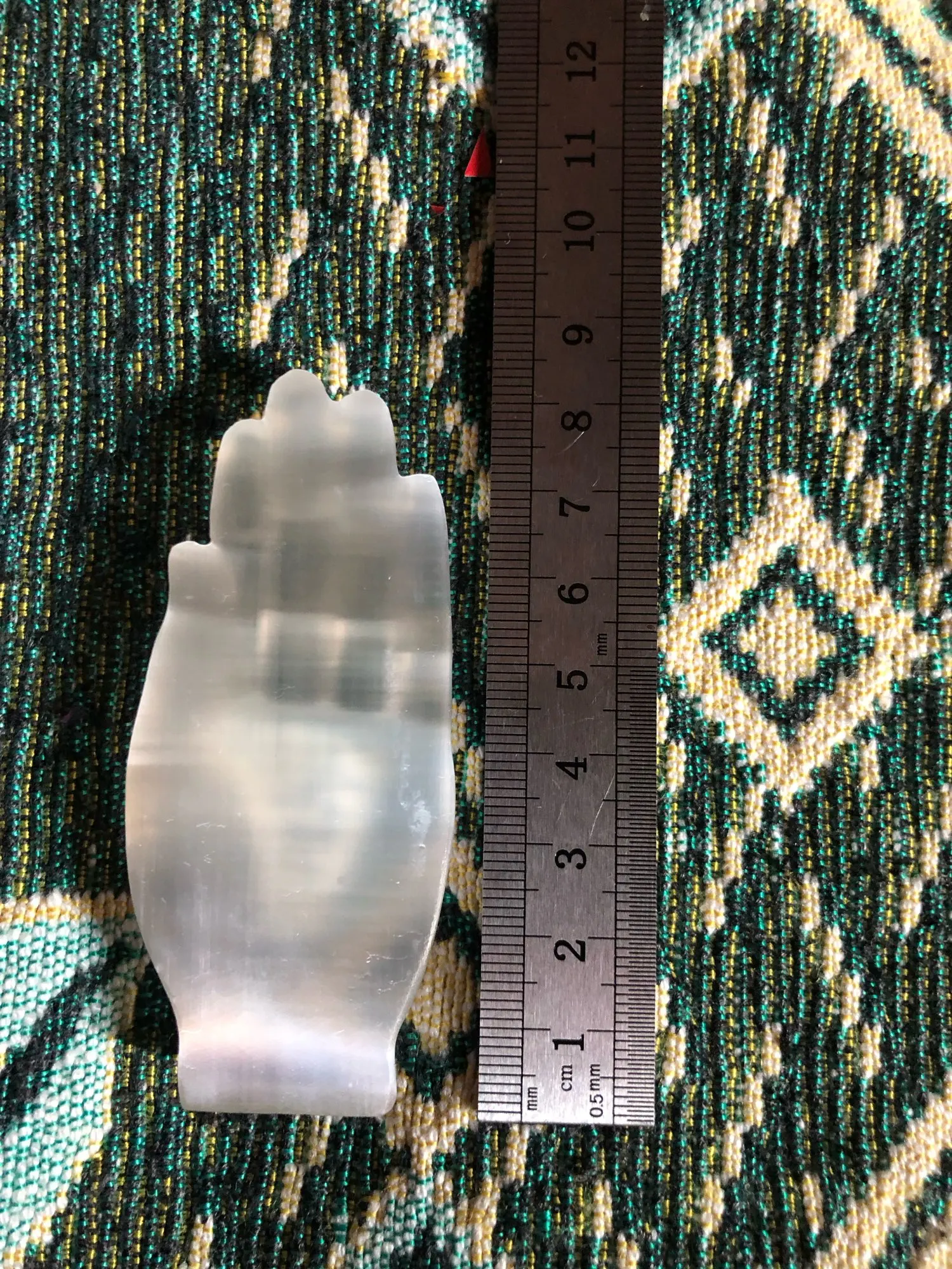 Okay, well! Selenite carved hand as described in the ad. The sculpture is pretty. I am a little surprised at the hardness of the stone; Selenite is usually much plus fragile. I’m going to show it to a gemologist to give me his opinion.