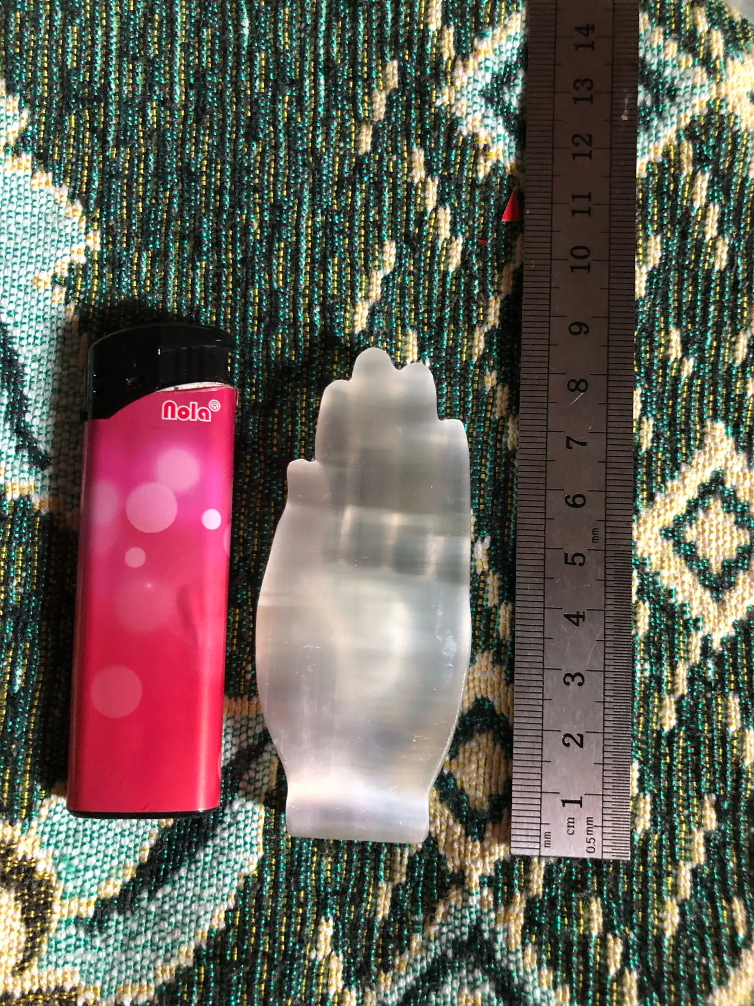 Good. Pretty hand in melenite. It is not extremely large, but it is rather well made given the fragile nature of the material. I had bought several stone items for a friend who came to visit me, she misses them within two days because of a small delay in delivery. I’m gonna have to send him by post.