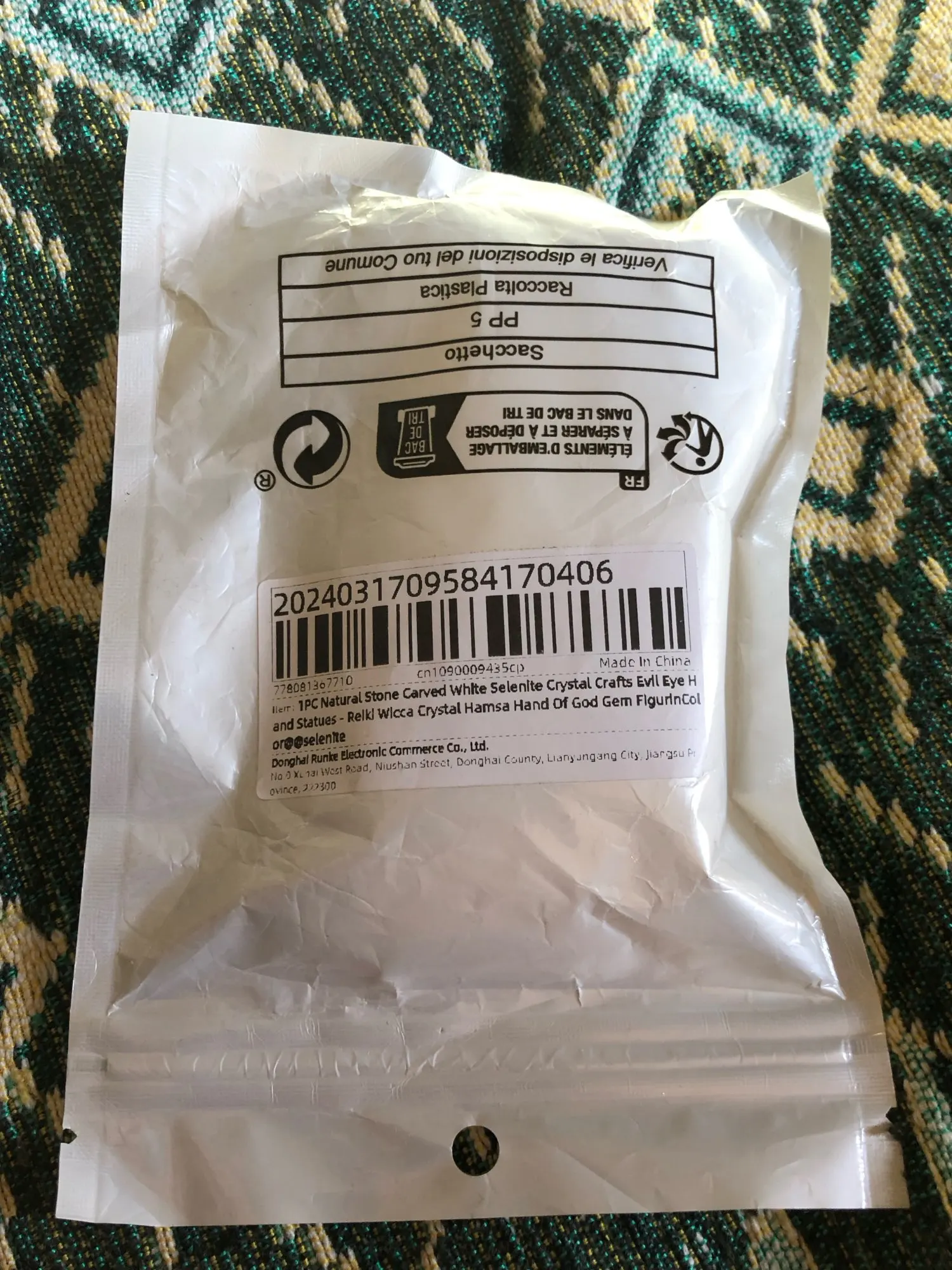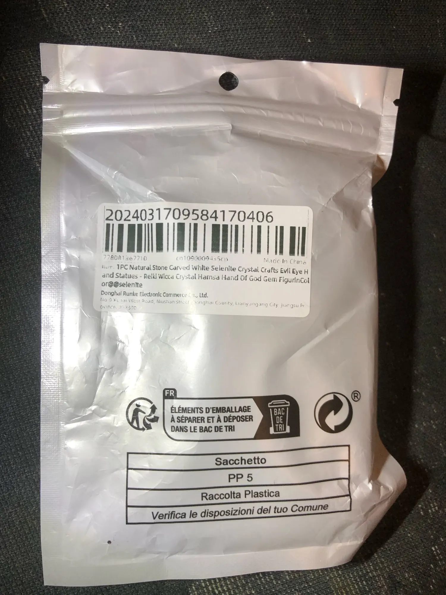 Good. Hand carved in selenite as described in the ad. I had already bought some and am always pleasant surprised at its good condition, given the fragility of the selenite it seems that the oily substance around it each time is office protective. The item arrived in a plastic bag with a little mousse paper.