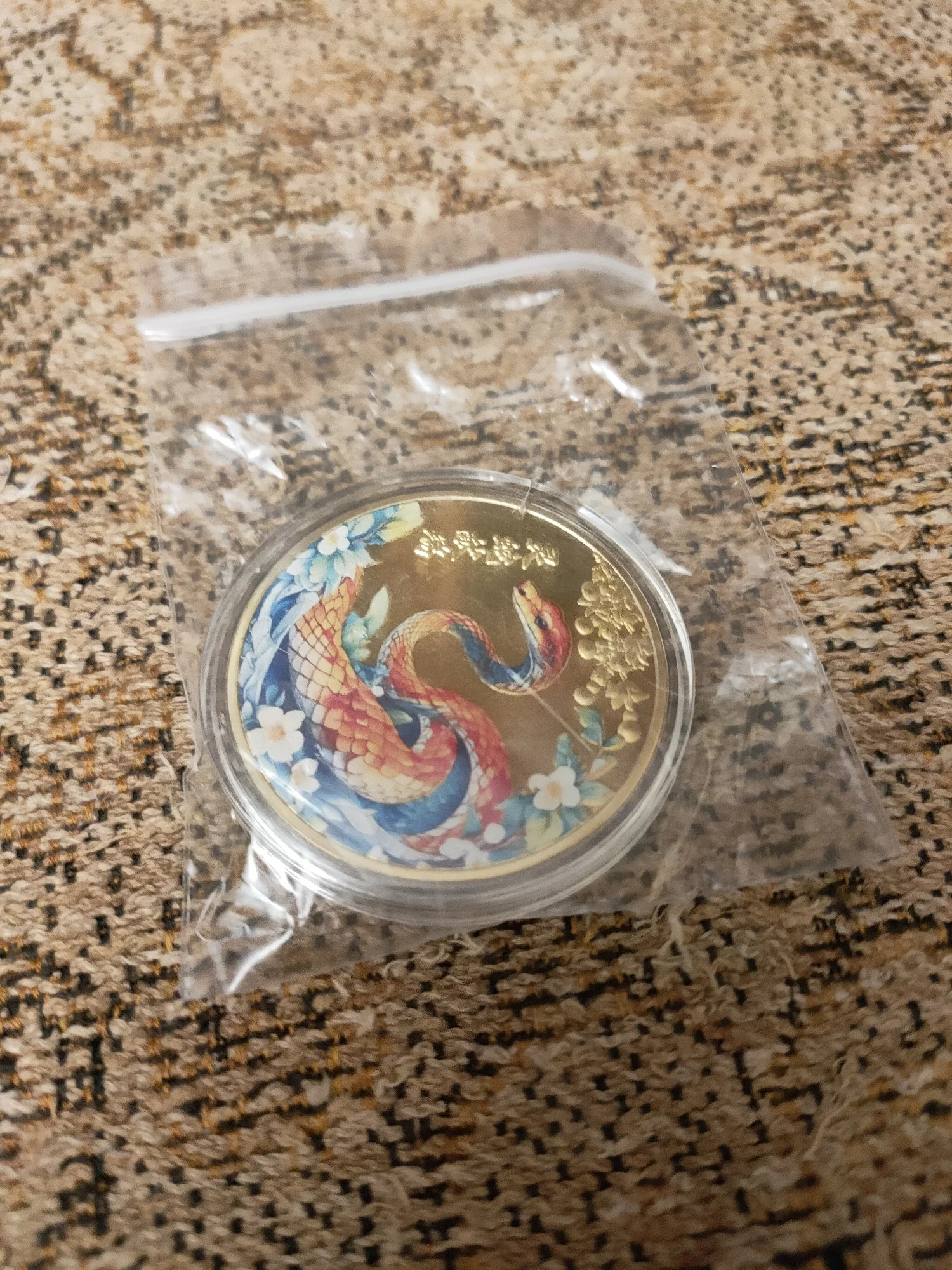 This is the best and most beautiful snake of seven ordered, on the back of the medal there are good-wishing symbols, the box is slightly convex, it is pleasant to pick up. Thank you seller for the quality product!