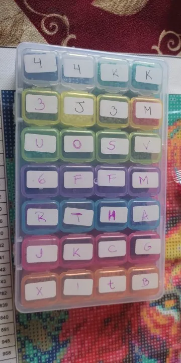 holds a lot of beads and I didn’t expect it. definitely needed for our diamond art. comes with a lot too, very useful and worth the price. the cone to put all the beads in is a life saver speeds up the process of taking everything out of bags. love the different sizes of the tools, usually it’s expensive for the bigger and wider sticky pens, and they’re not a cheap material either. the 28 grid was good enough for me but even buying the bigger option would be a great idea. I just believe overall it was great for storage and useful if you do diamond art.