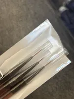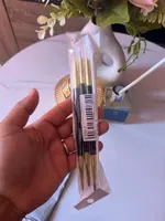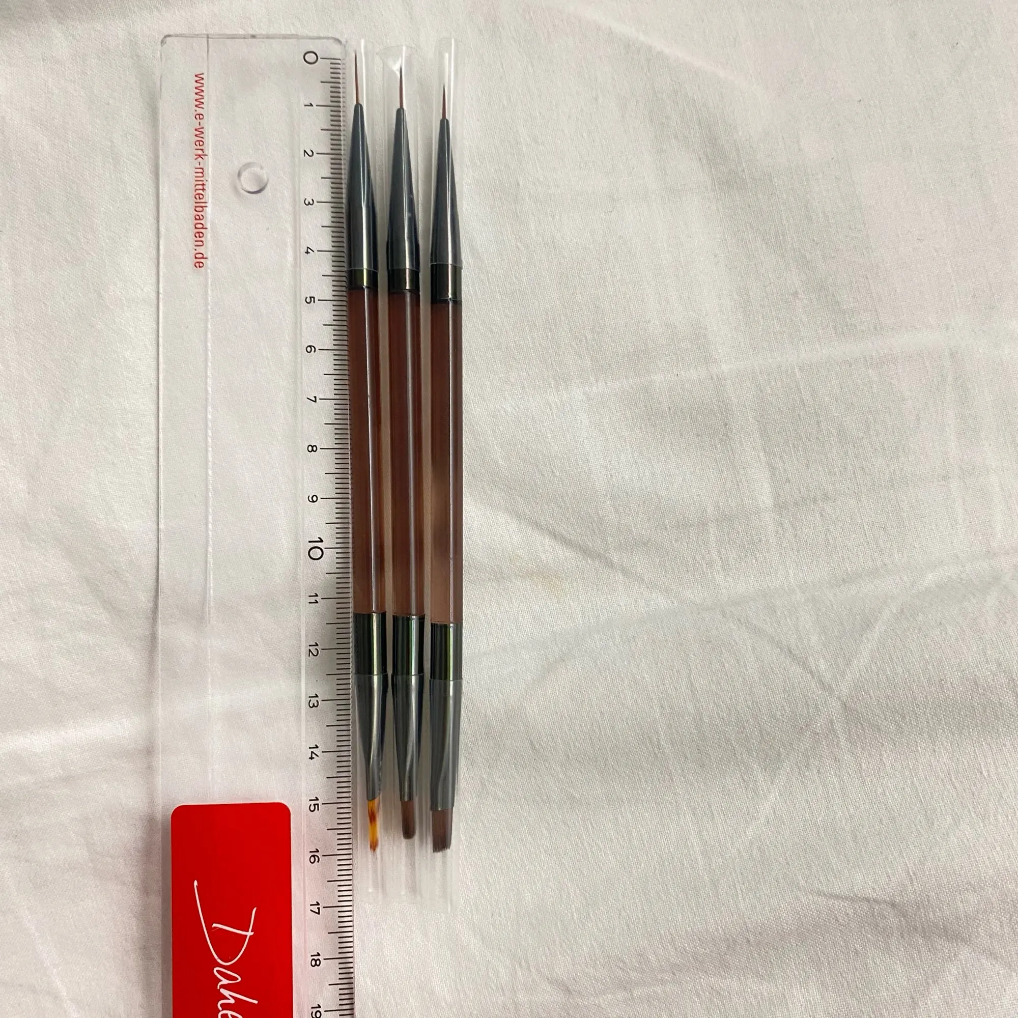 Good brushes. The pile does not fit. There is literally 1 protruding hair, you can remove with scissors. Thin brushes are perfect. Length with Caps 17 cm. Look decent outwardly. The handles are transparent. Arrived in Germany 2 days before the end of the term. I recommend it.