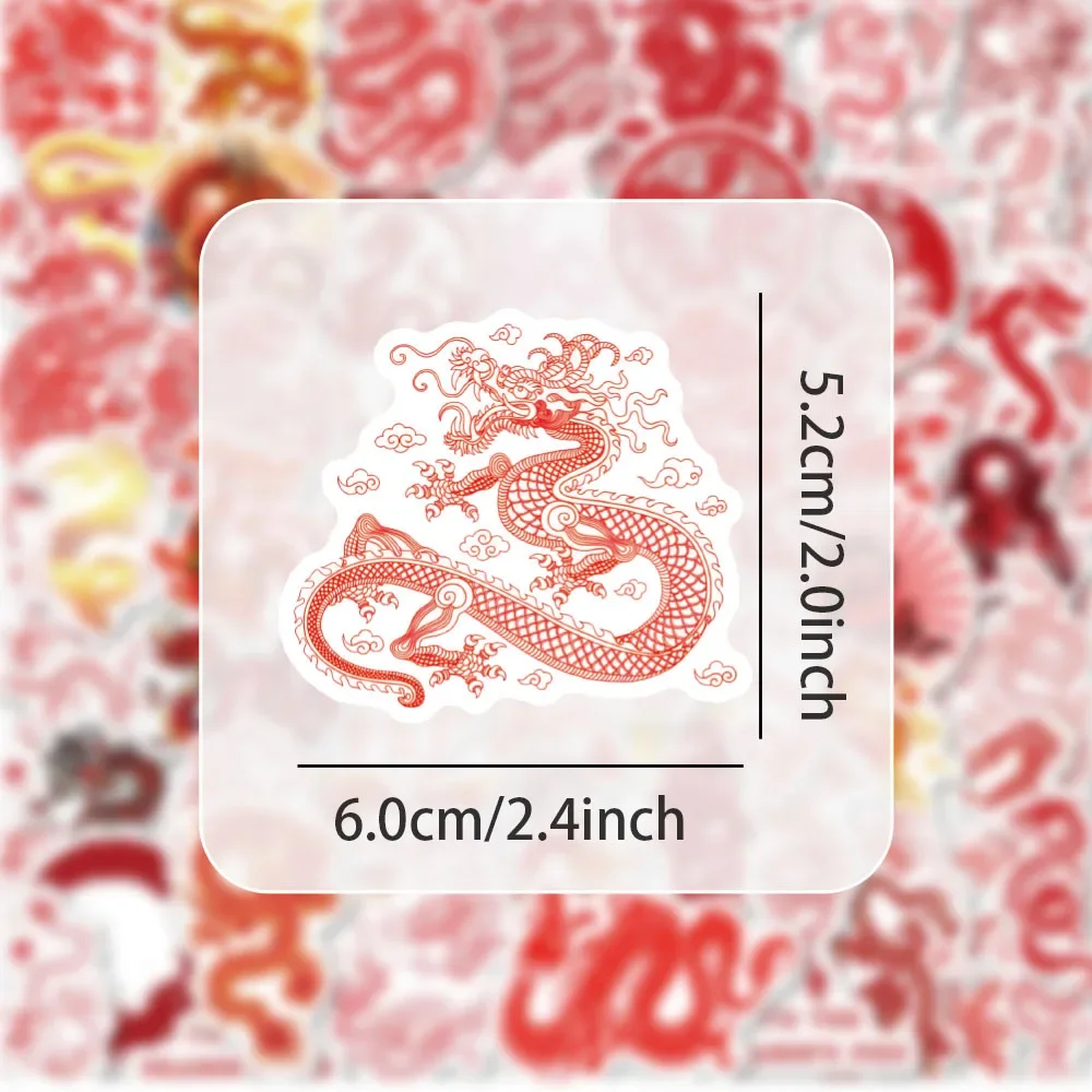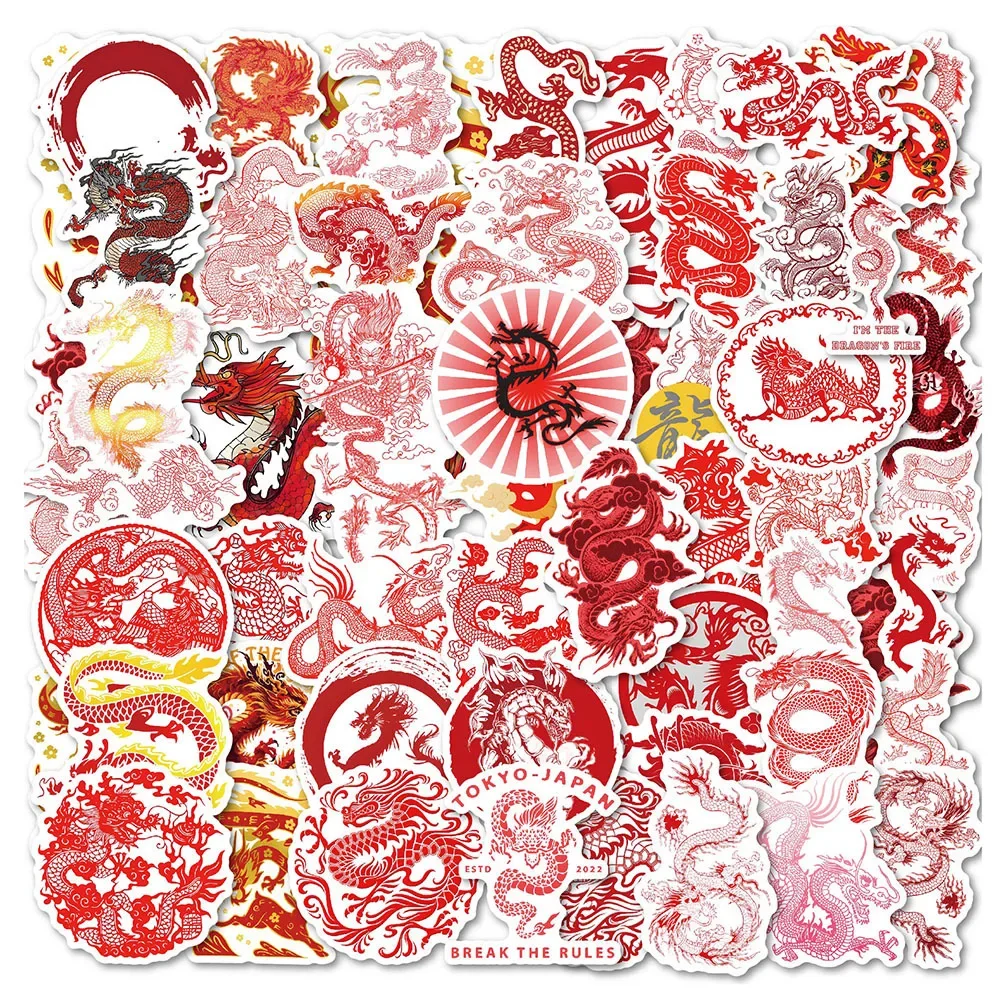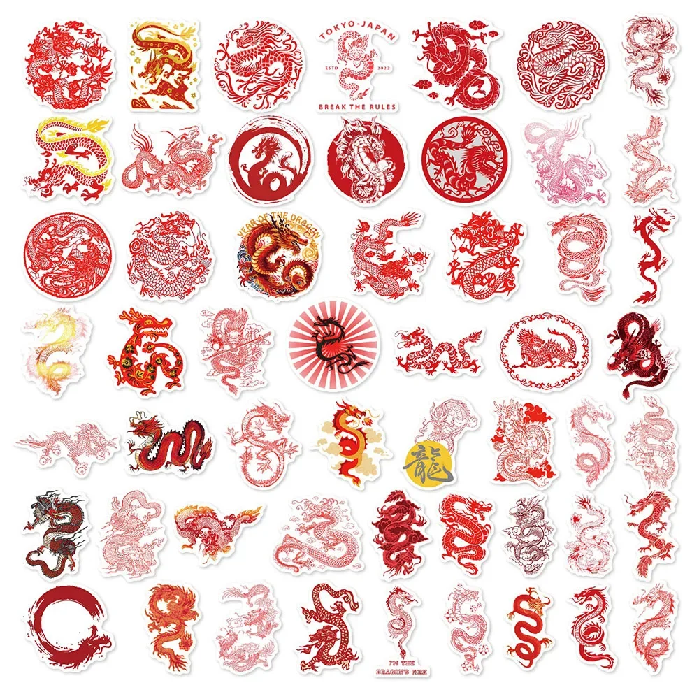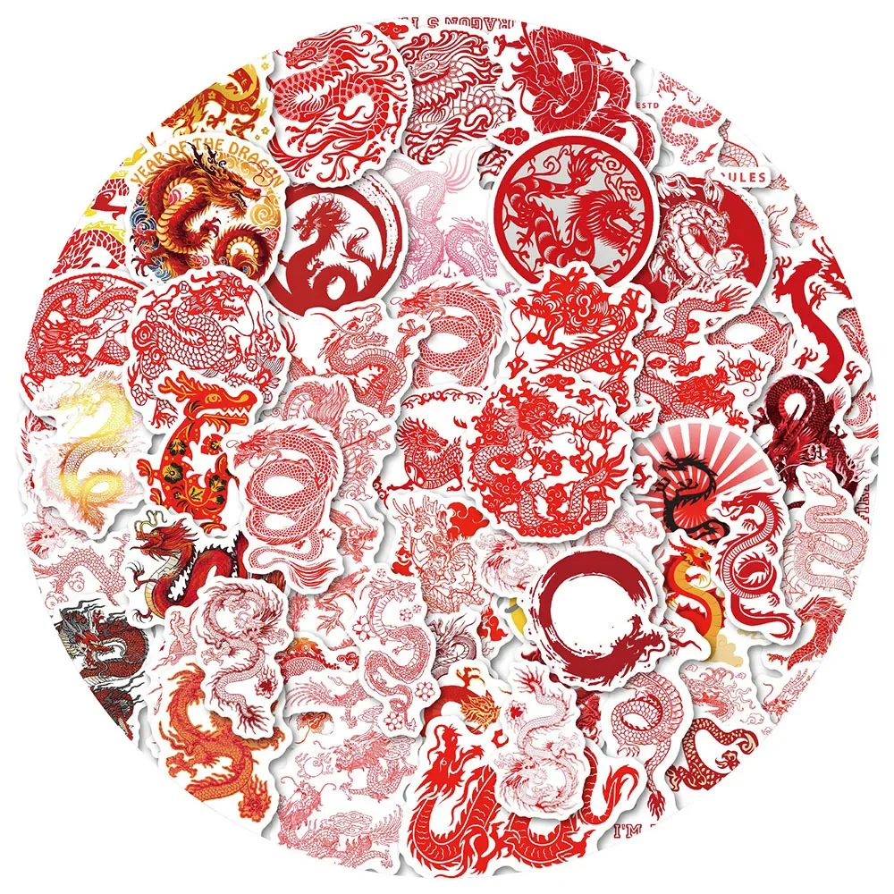 50PCS Chinese Dragon Cartoon Stickers Paper Cutting Zodiac Animal Phone Diy Shell Water Cup Waterproof Decorative Sticker Toys