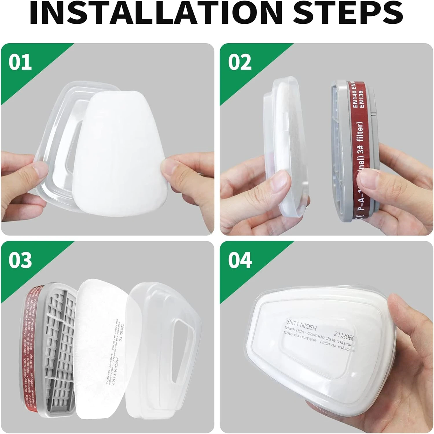 【Compatibility】Filter Cotton can be used with 6000 series cartridges, 501 filter retainer, and most gas respirators (such as 6100, 6200, 6502, 7501, 7502, 6800, and FF402)