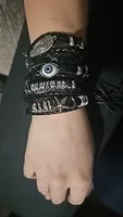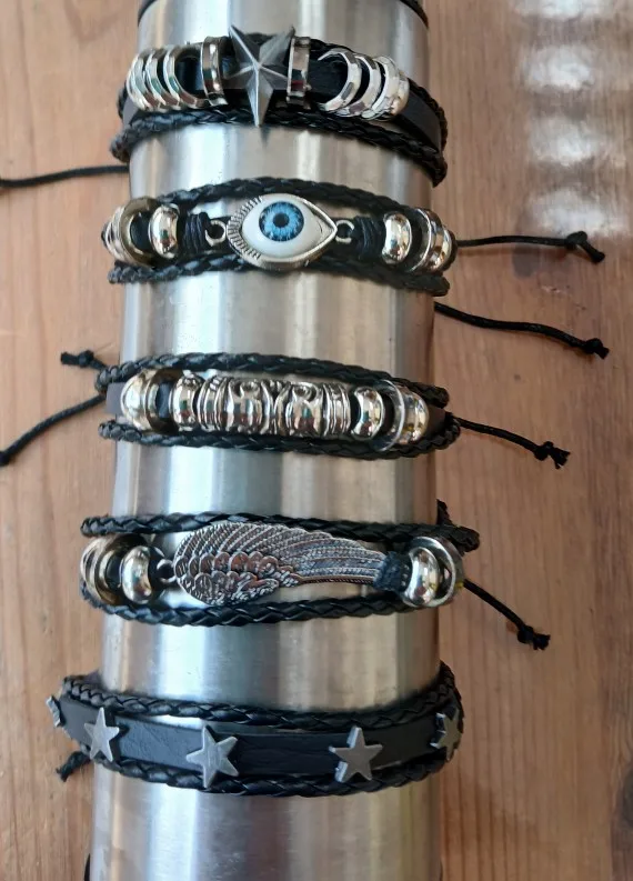 【Punk Leather Bracelet】: 5-piece black leather bracelet set, different hand-woven leather bracelets for men and women, you can wear them together or alone, or share them with your friends and family. Gothic skull bracelets, feather bracelets, stud bracelets, pentagram bracelets, a wide selection.