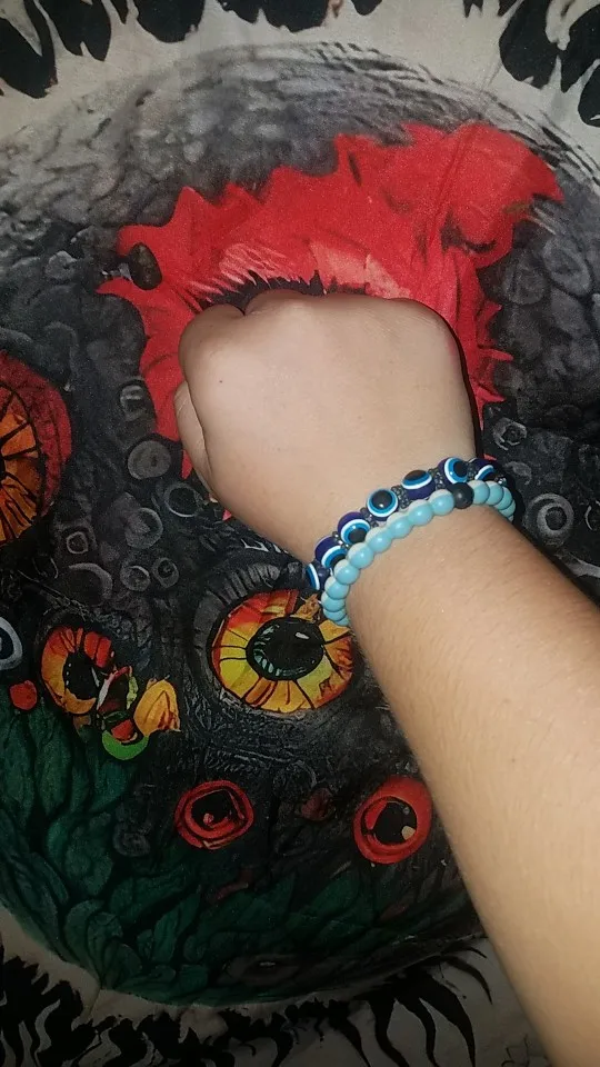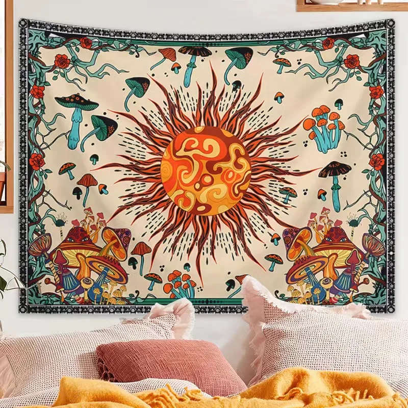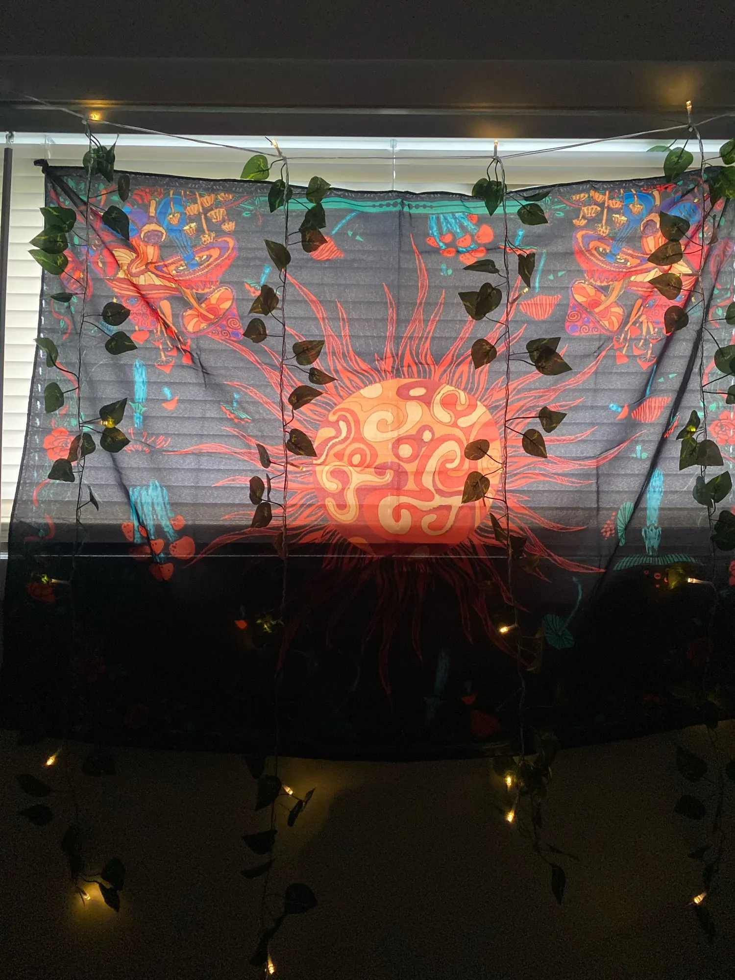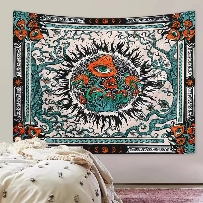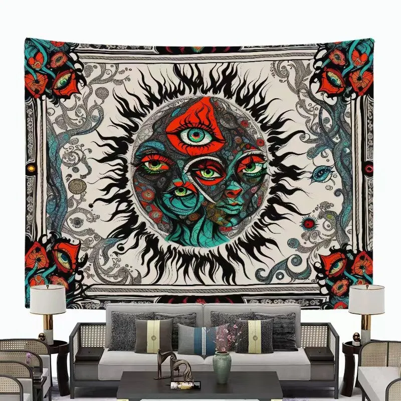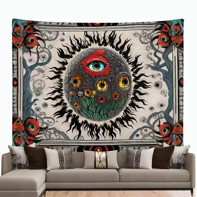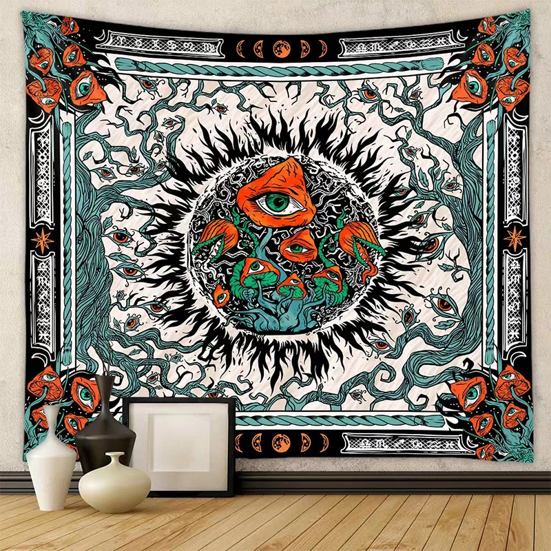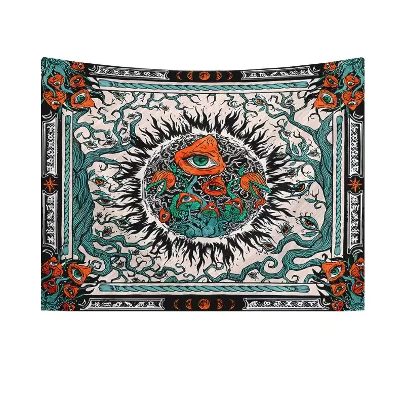 A Large Fantasy Mandala Flower And Plant Tapestry Adorned With Eerie Eyes And a Background Cloth Burning In The Sun
