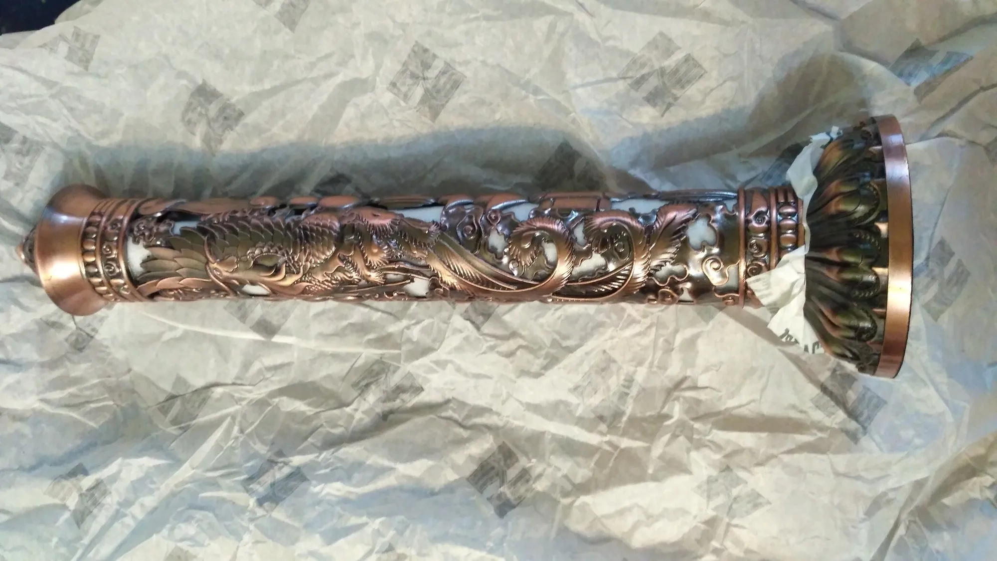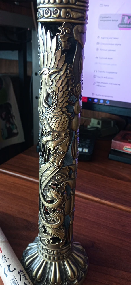 Sending the parcel within 24 hours. The parcel arrived in Kazakhstan in 18 days. Everything came safe and sound. A metal washer with three holes for different diameters of the sticks lay in an additional bag with incense sticks, I did not immediately find it. It just lies in the round groove of the base-do not lose it when you shake the ash out of the base. The column at the bottom does not twist in any way, but millet is put on-this is enough to maintain balance. Incense sticks-the gift from the seller smells more like burned wood than the declared Wormwood. In general, the product is a certain artistic value. On one side of the image the bird is a Phoenix, and when turning 180 degrees, the Chinese dragon. In general, it is beautiful and convenient for incense.
