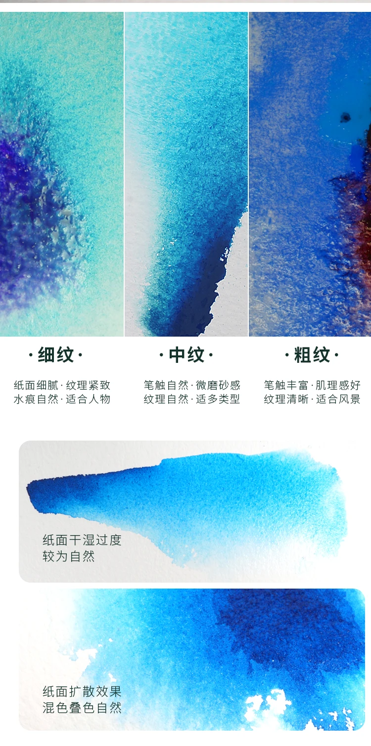 【TEXTURE】COLD-PRESSED finish has a light texture surface but provide strong scrub resistant, allowing for a variety of watercolor techniques.