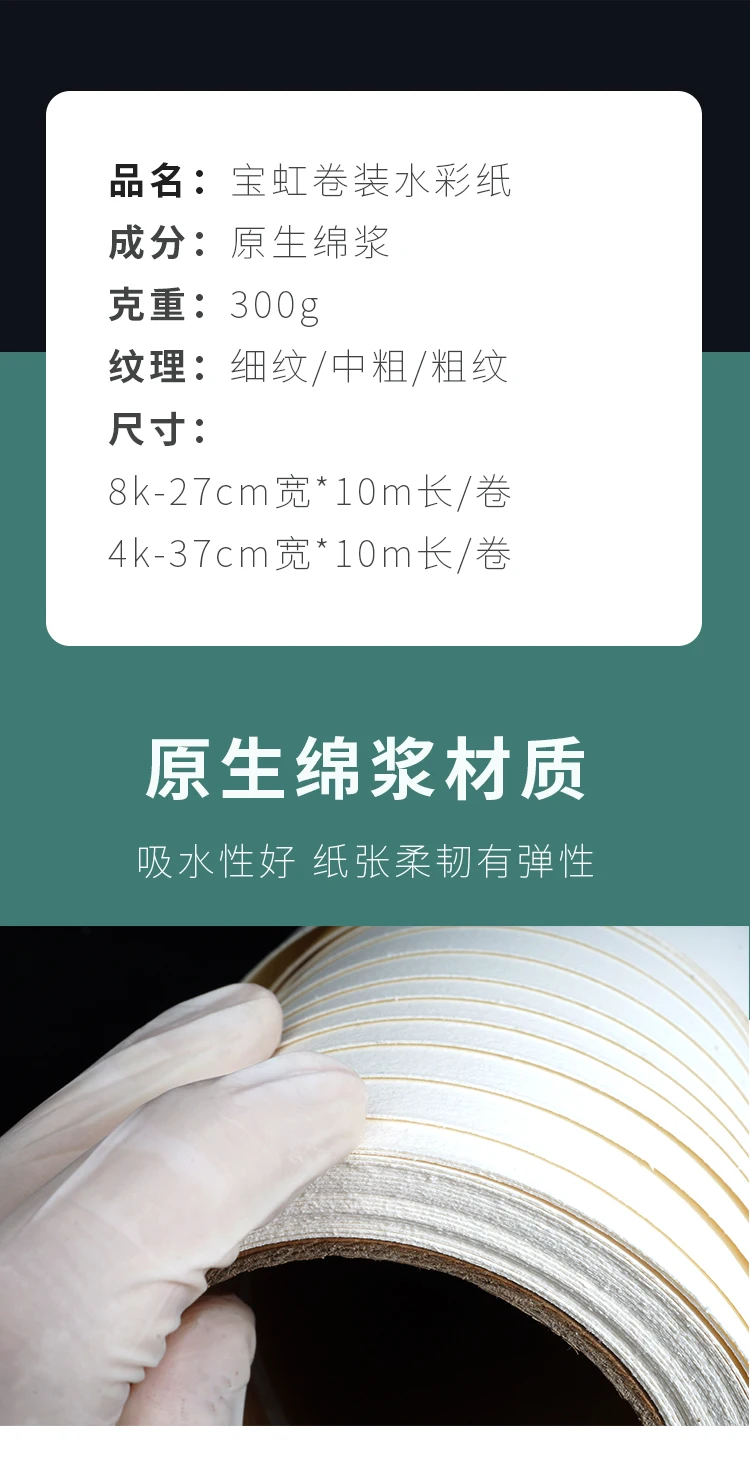 【CONTENT】1 roll with 27/37cmx10m(10.63inchx394inch/14.57inchx394inch) of 140lb/300gsm watercolor paper and is glued on four edges to eliminate the need for stretching and avoids cockling.