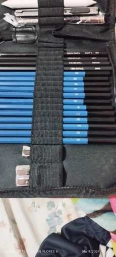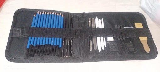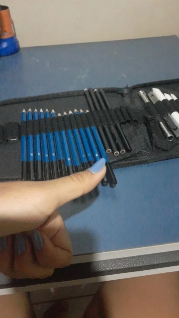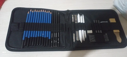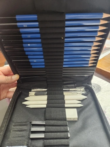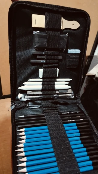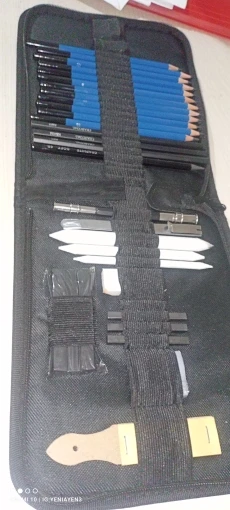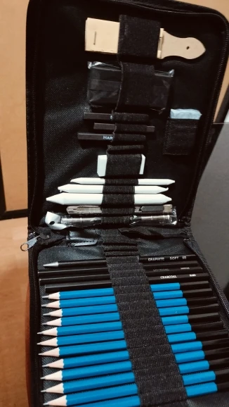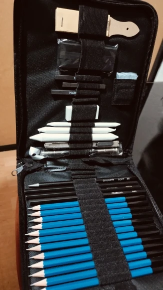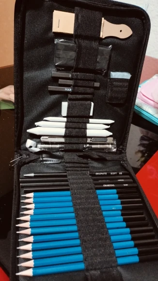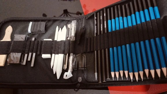 Has everything you need to start in the world of drawing, from the softest pencils to make sketches to the strongest, they also have charcoal of various types and cuter to make charcoal powder, white things I didn’t know, But once proven I have realized that I do not know how I could live without it, very suitable to make shadows without showing the lines. It has a device to grab pencils that are running out comfortably, so nothing is wasted. And several things that I do not know its use. For beginners is a recommended jewel.