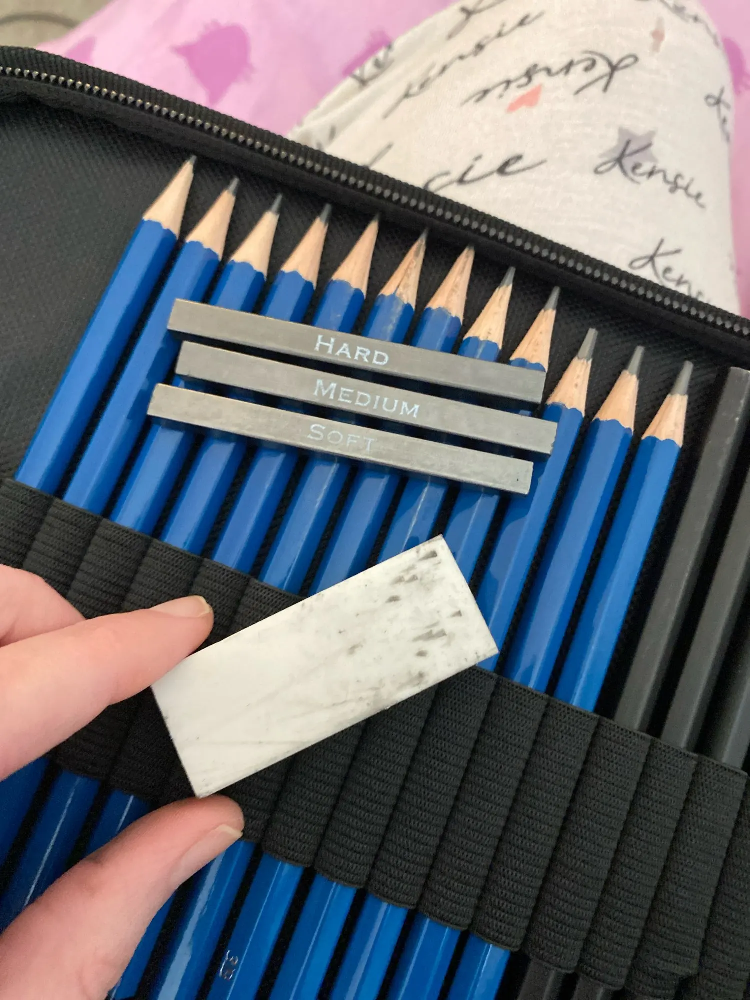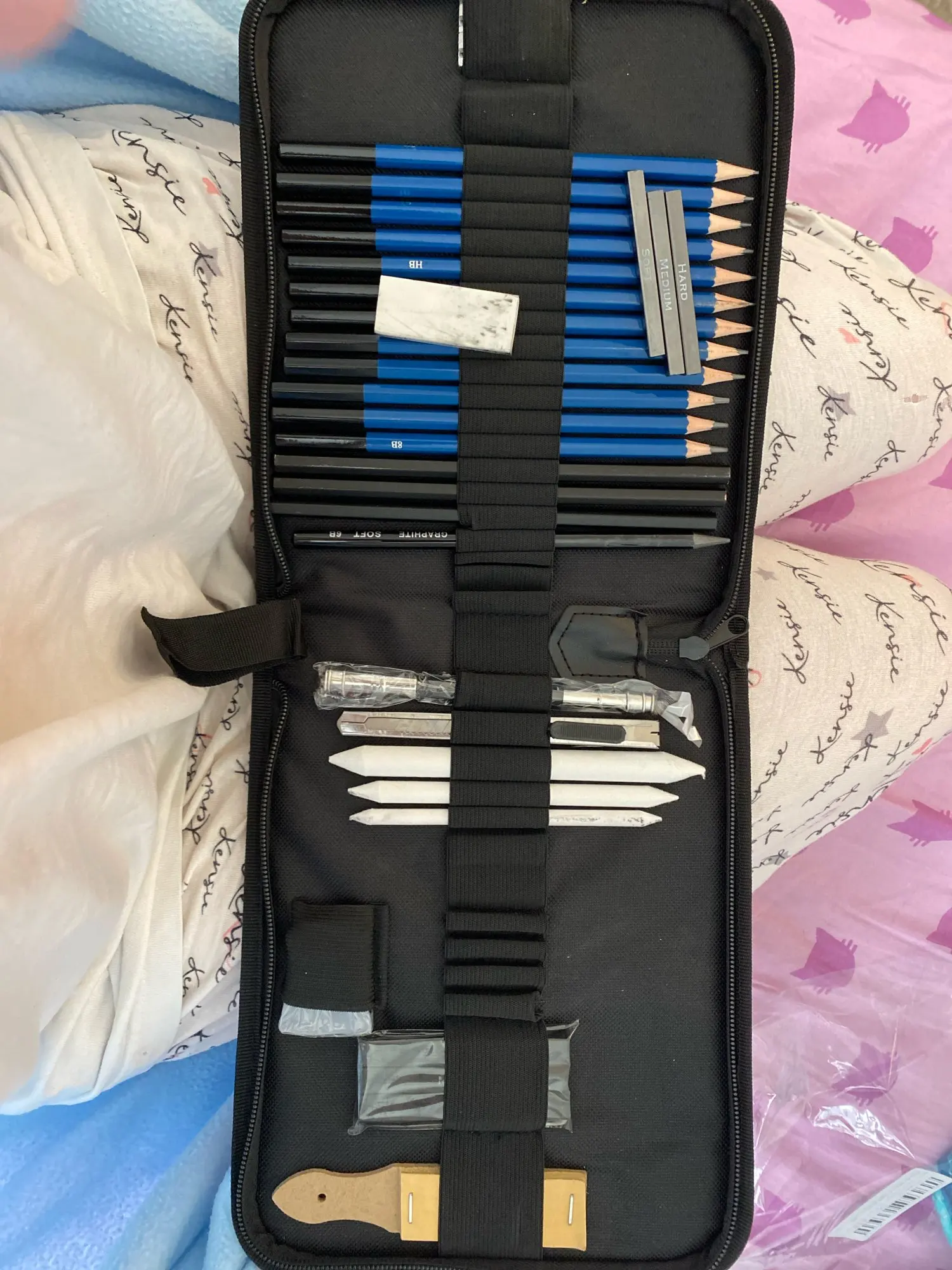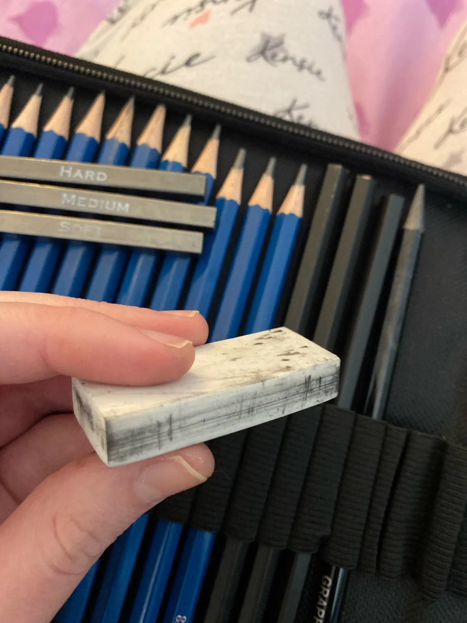 It’s wonderful! It’s got everything I needed! Just one problem. Some of the charcoal arrived without a casing, and now the eraser is filthy and so is the pencil one. C’mon, how does that happen?