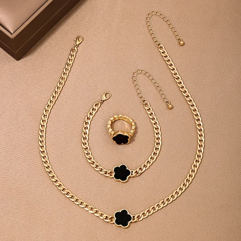 Lucky Five-petal Flower Clover Earrings Necklace Ring Bracelet Four-piece set for Woman Fashionable Accessories Party Jewelry