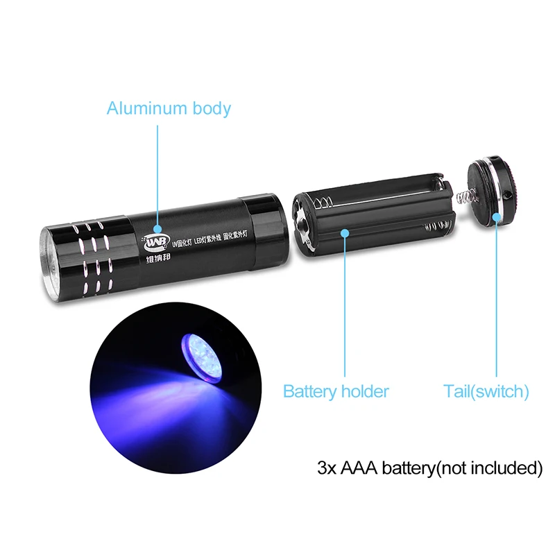 The UV light is too weak. Useless. I used this glue to cover all the sansui2000a circuit boards. A fairly large area. I had to put it out in the sun at 12 noon. And I used a magnifying glass to focus the light on the areas where the glue was too thick. Very quickly, within 30 minutes the glue was completely dry.