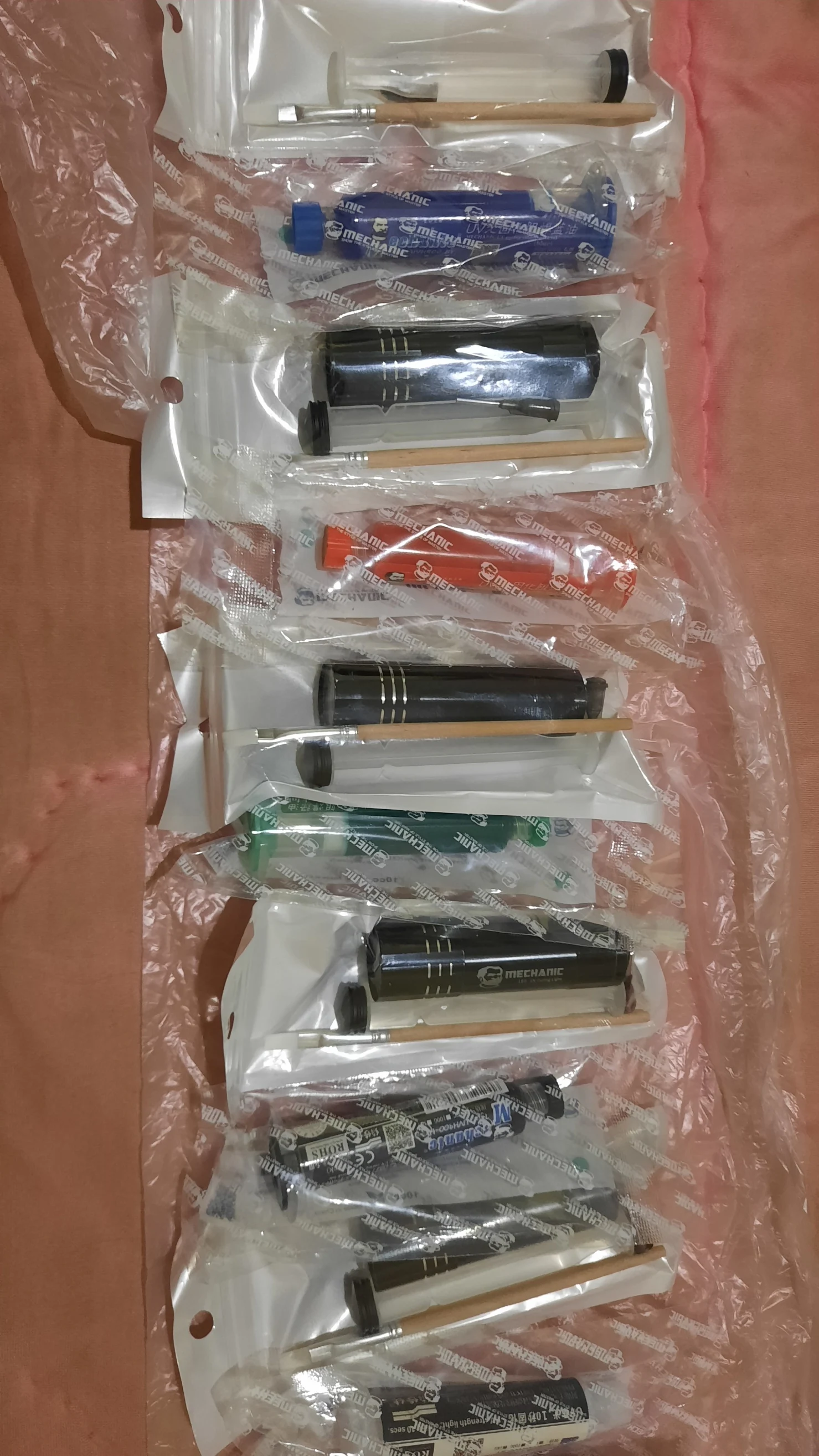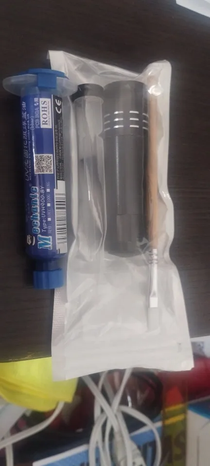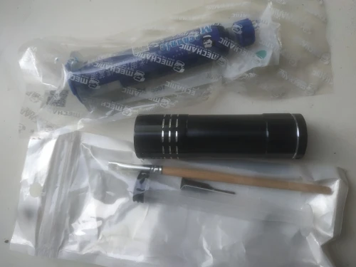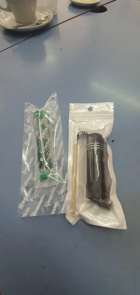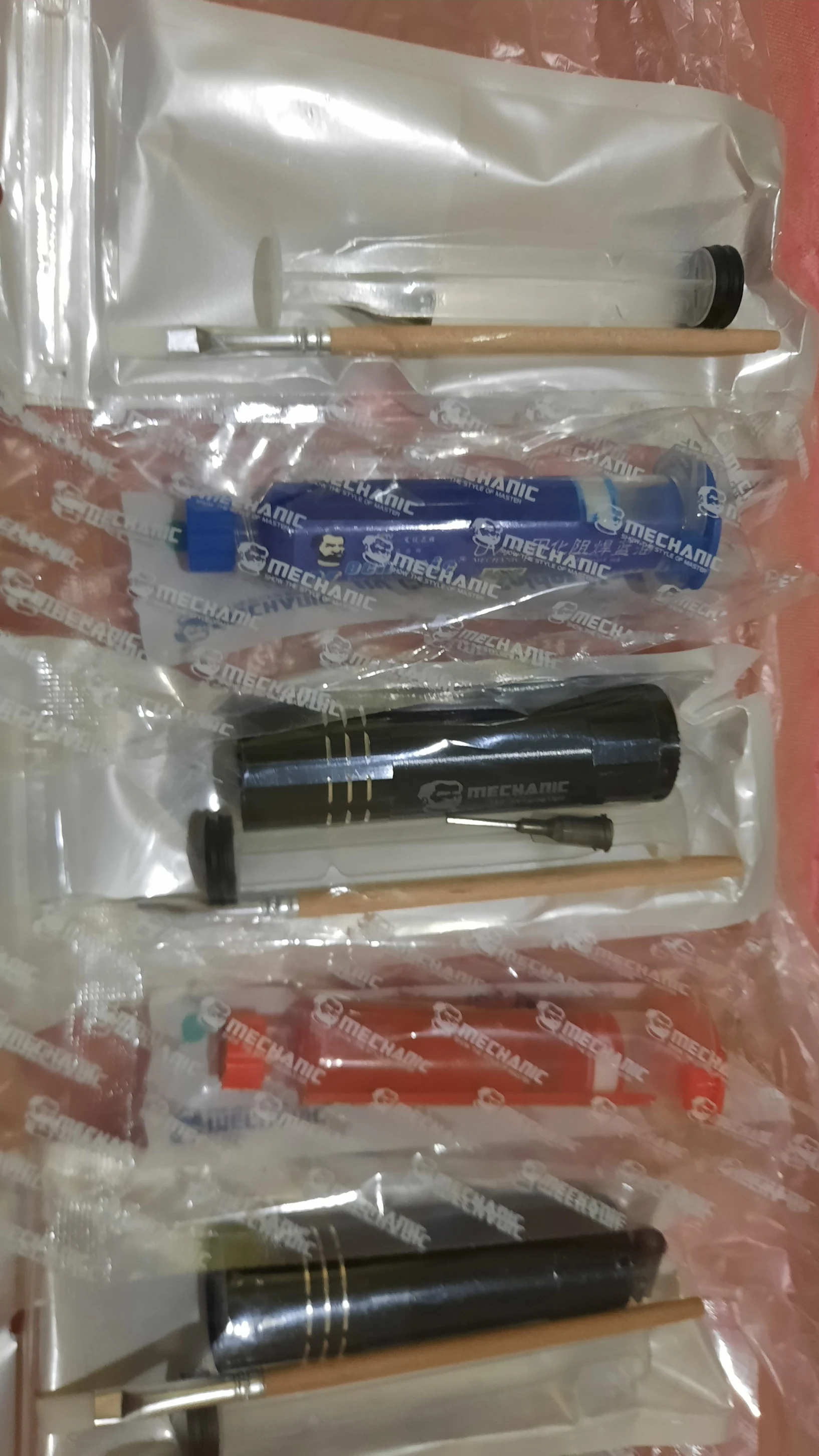 The flashlight is the simplest under three AAA batteries. I did not check the mask, perhaps later I will add a review if it turns out to be bad. The kit includes a thick brush, a syringe pusher and a needle. Took a discount with coins