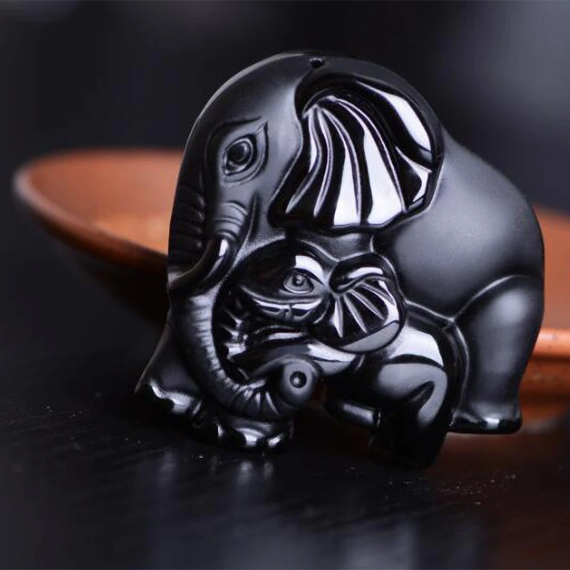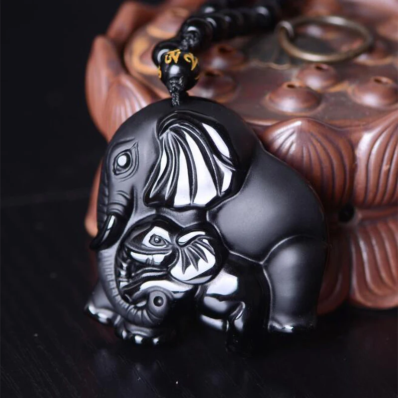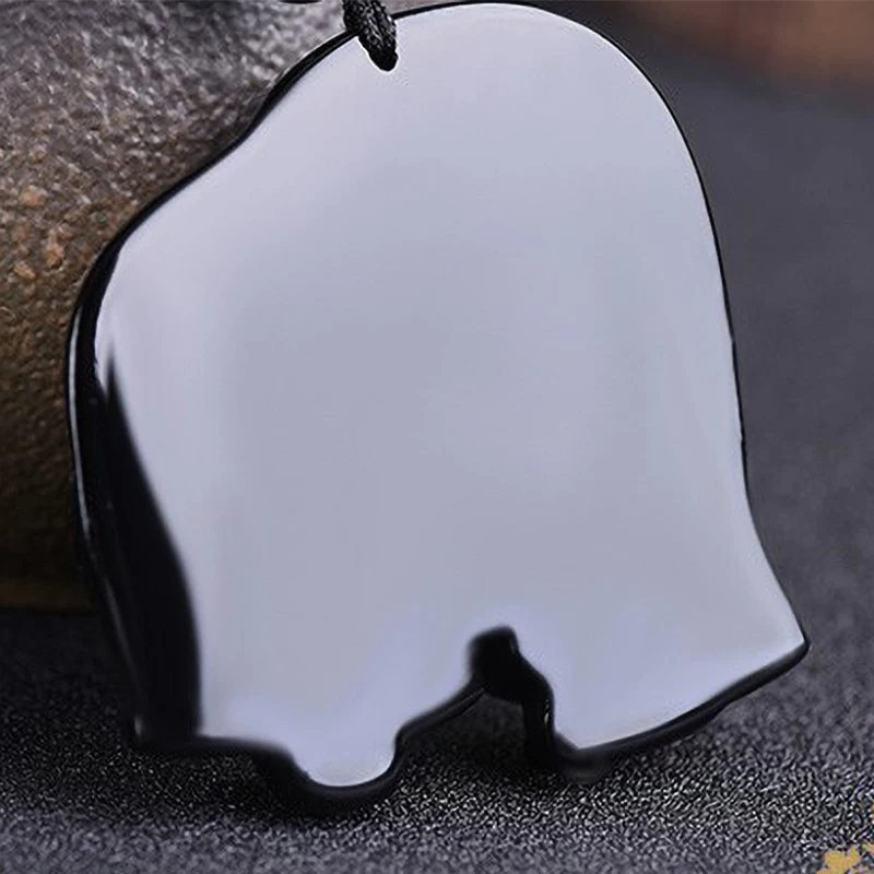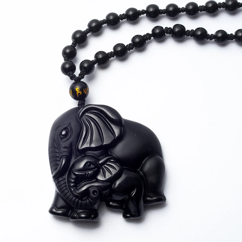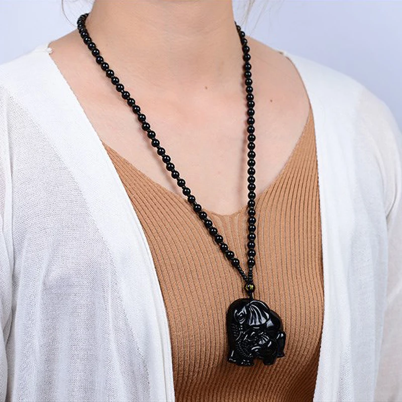 Natural Obsidian Carved Elephant Necklace for Women and Men God of Wealth Luck Pendants Black Obsidian Necklace Chain Gifts