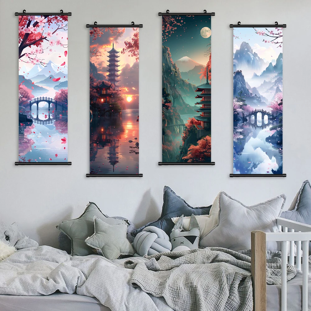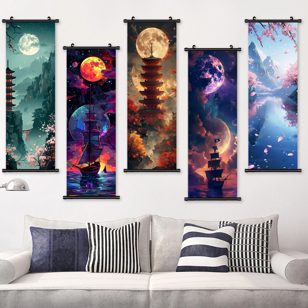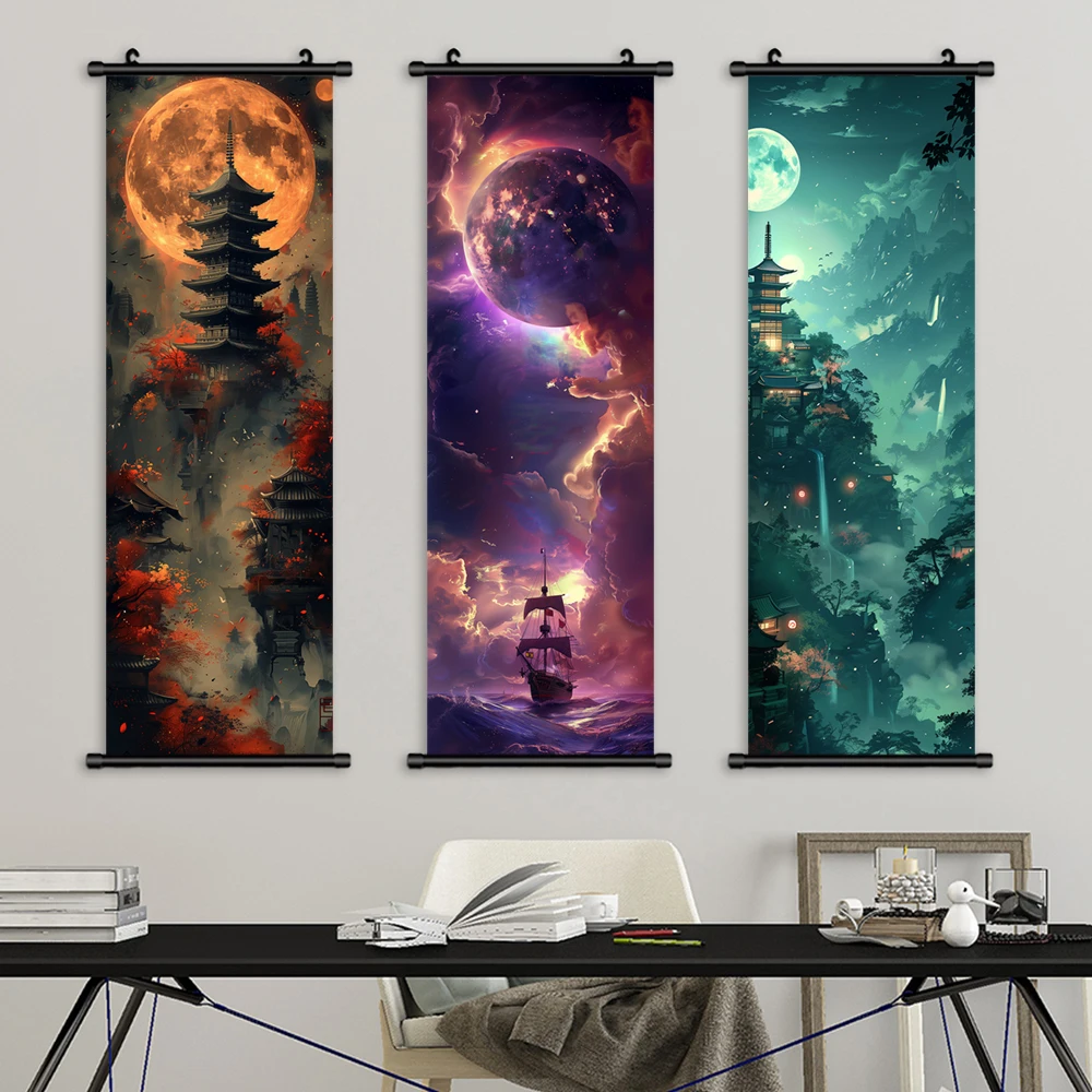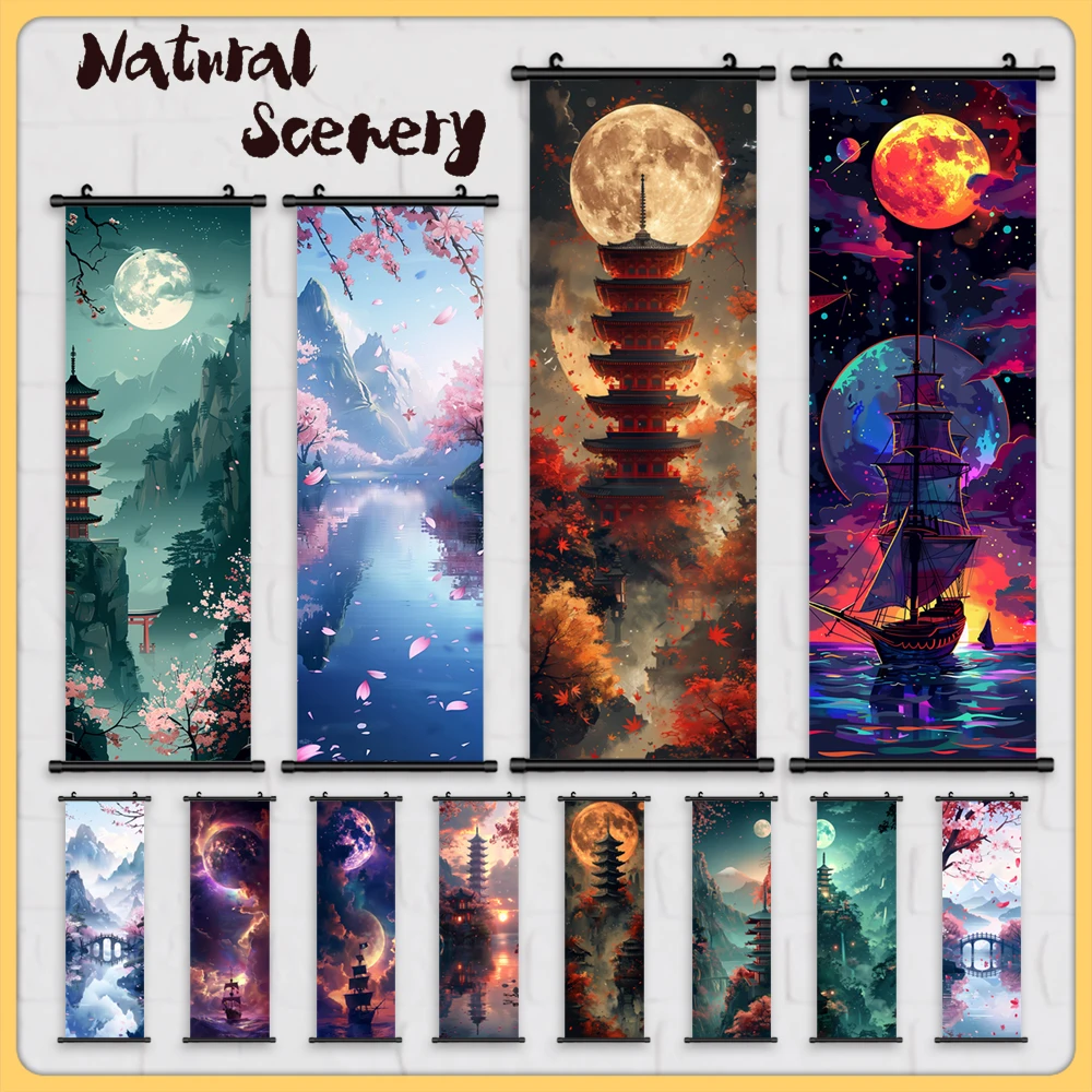 1pc Home Decor Natural Scenery Canvas Wall Art Moonlight Lake Scrolls Hanging Anime Paintings HD Print Modular Picture Poster