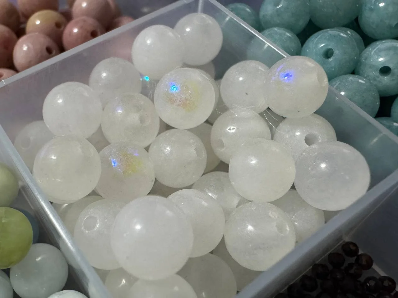 Very beautiful beads. Did not count, but judging by the occupancy of the cell-there are really about 60 of them (completely filled, at a time when exactly 30 beads occupy about half). Natural, very soft, unobtrusive and generally beautiful overflow, which is difficult to catch with the camera.