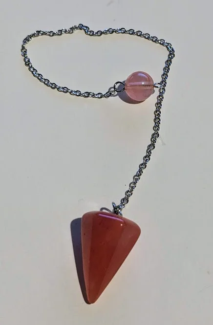 The shape is a little different than the listing image. The stone is semi-translucent in areas and sort of a coral color in others. A fun little pendulum.