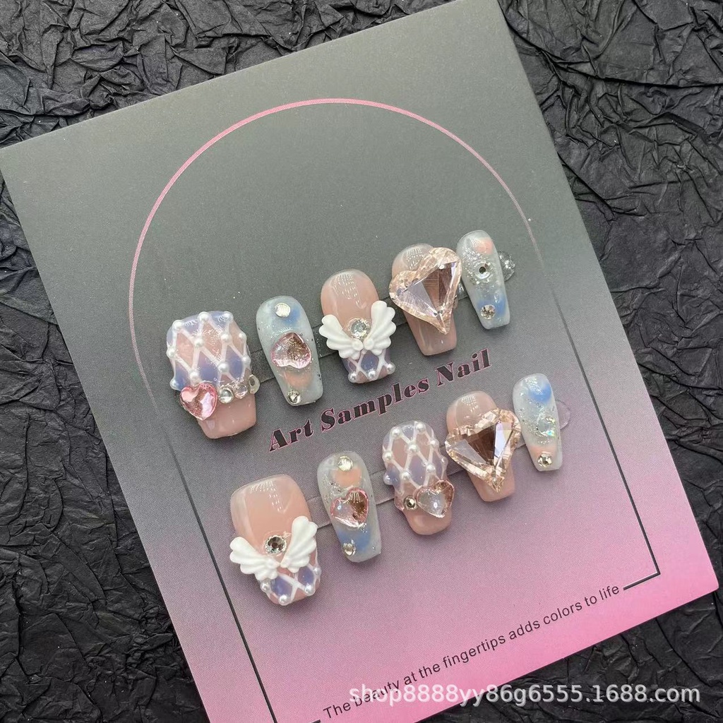 Sakura Nail Art Sweet Dreamy Fantasy Handmade Wearable Nails Angel Wings Nail Patches Pink Love Diamonds Fake Nails