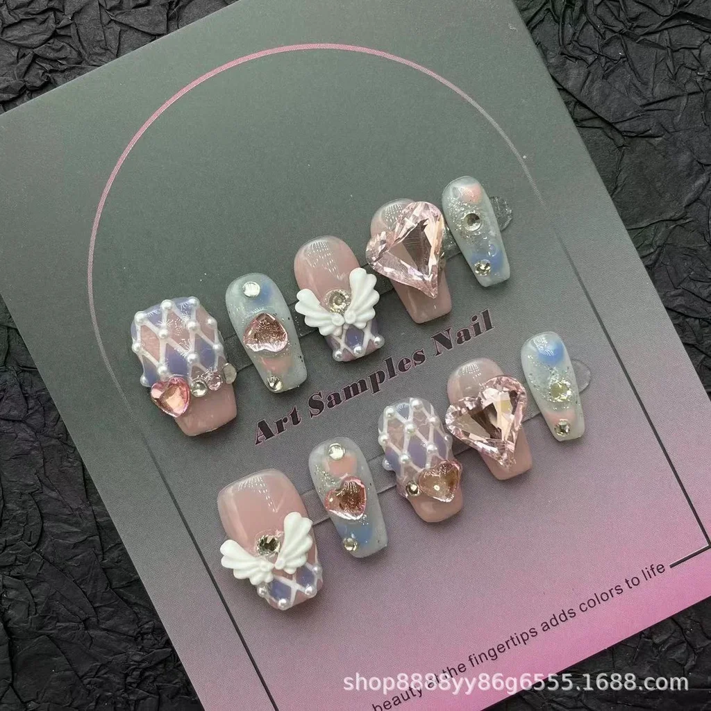 Sakura Nail Art Sweet Dreamy Fantasy Handmade Wearable Nails Angel Wings Nail Patches Pink Love Diamonds Fake Nails