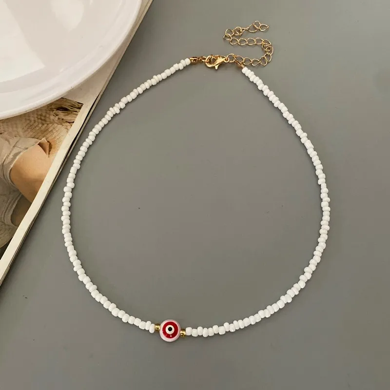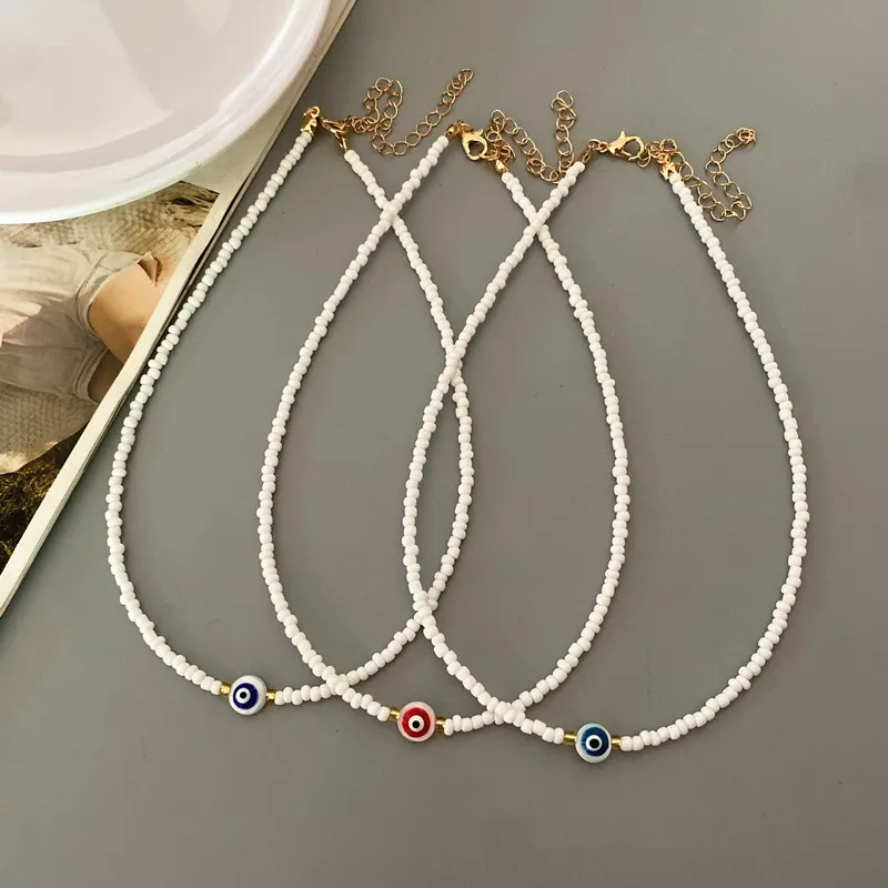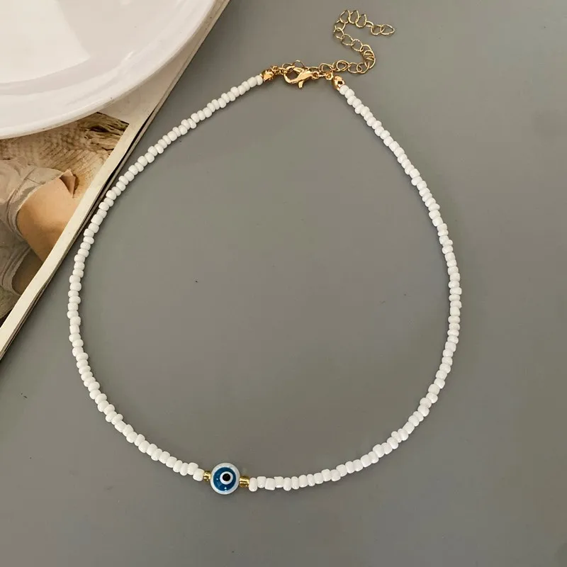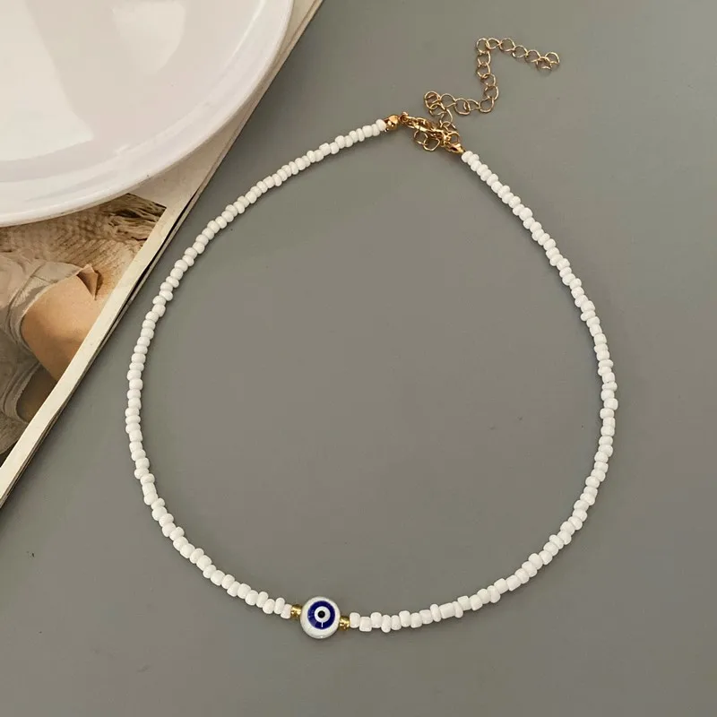 Turkey Lucky Eye Seed Beads Choker Necklace for Girl White Color Seed Beads Bohemian Short Necklace