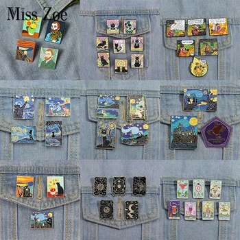 Oil Painting 3-5pcs/Set Enamel Pins Tarot Cards Night Sky Black Cat Brooches Lapel Badge Punk Gothic Jewelry Gift for Friends
